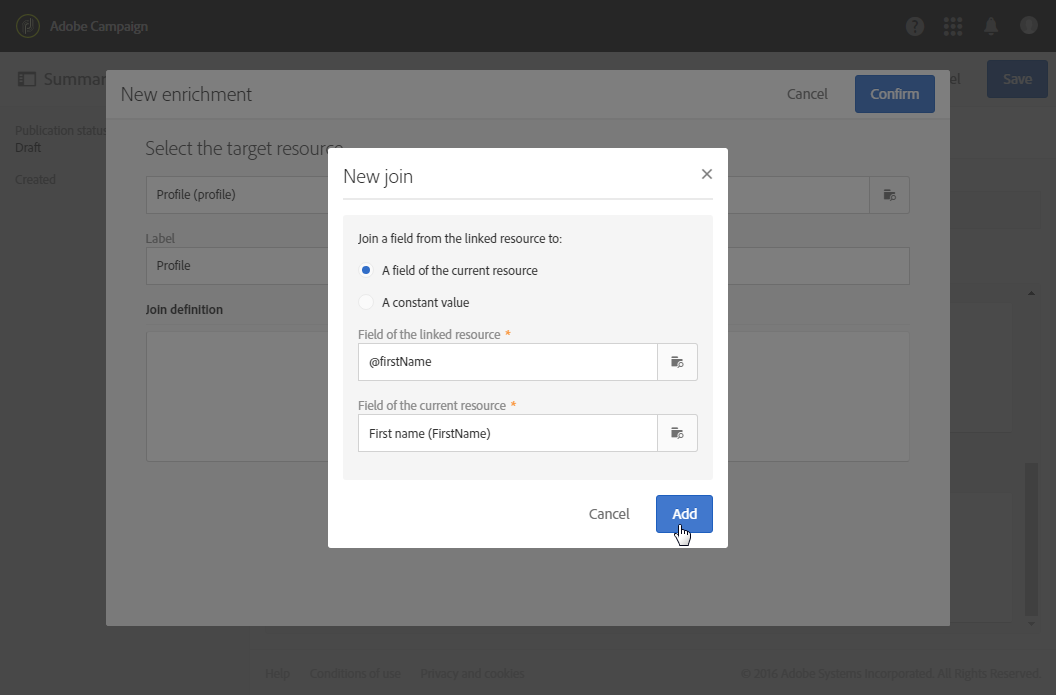 트랜잭션 메시지를 개인화할 수 있도록 이벤트에 필드를 추가합니다( 이벤트 속성 정의). 데이터 보강 작업을 수행하려면 필드를 하나 이상 추가해야 합니다. 다음과 같은 다른 필드를 만들 필요는 없습니다 이름 및 성 Adobe Campaign 데이터베이스의 개인화 필드를 사용할 수 있으므로