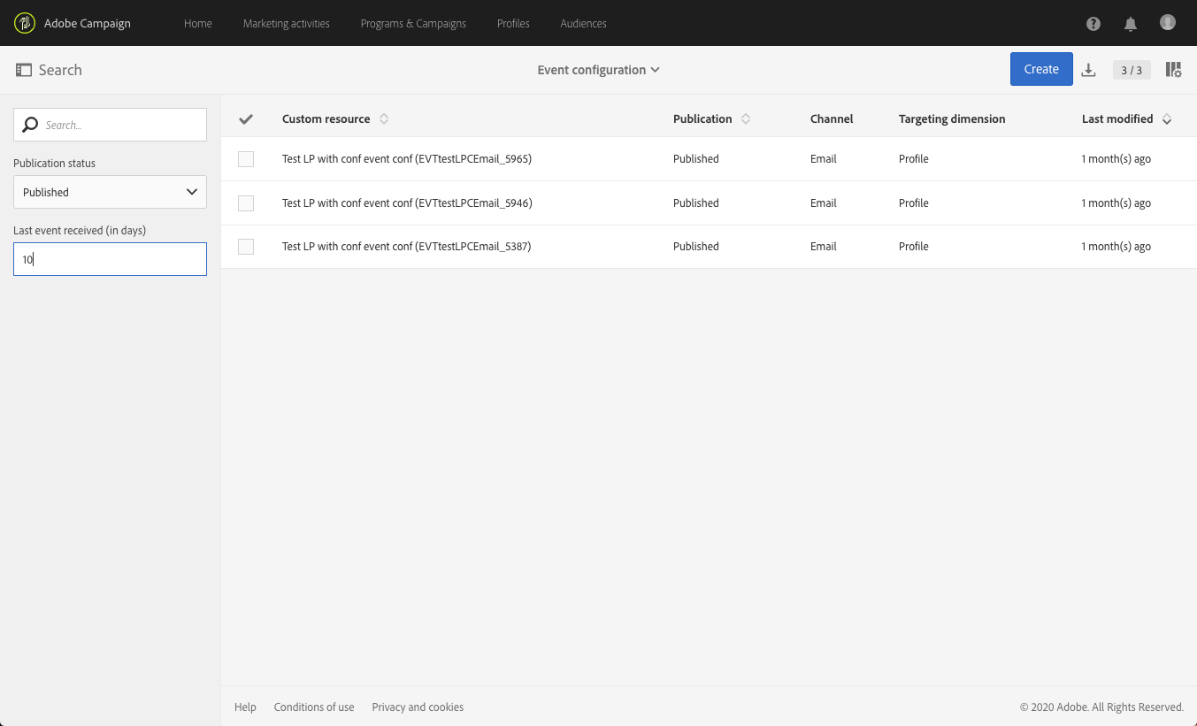 이벤트를 Last event received. 예를 들어 10을 입력하면 10일 전에 마지막으로 받은 이벤트가 있는 이벤트 구성만 표시됩니다. 이렇게 하면 지정된 기간 동안 비활성 상태인 이벤트를 표시할 수 있습니다.