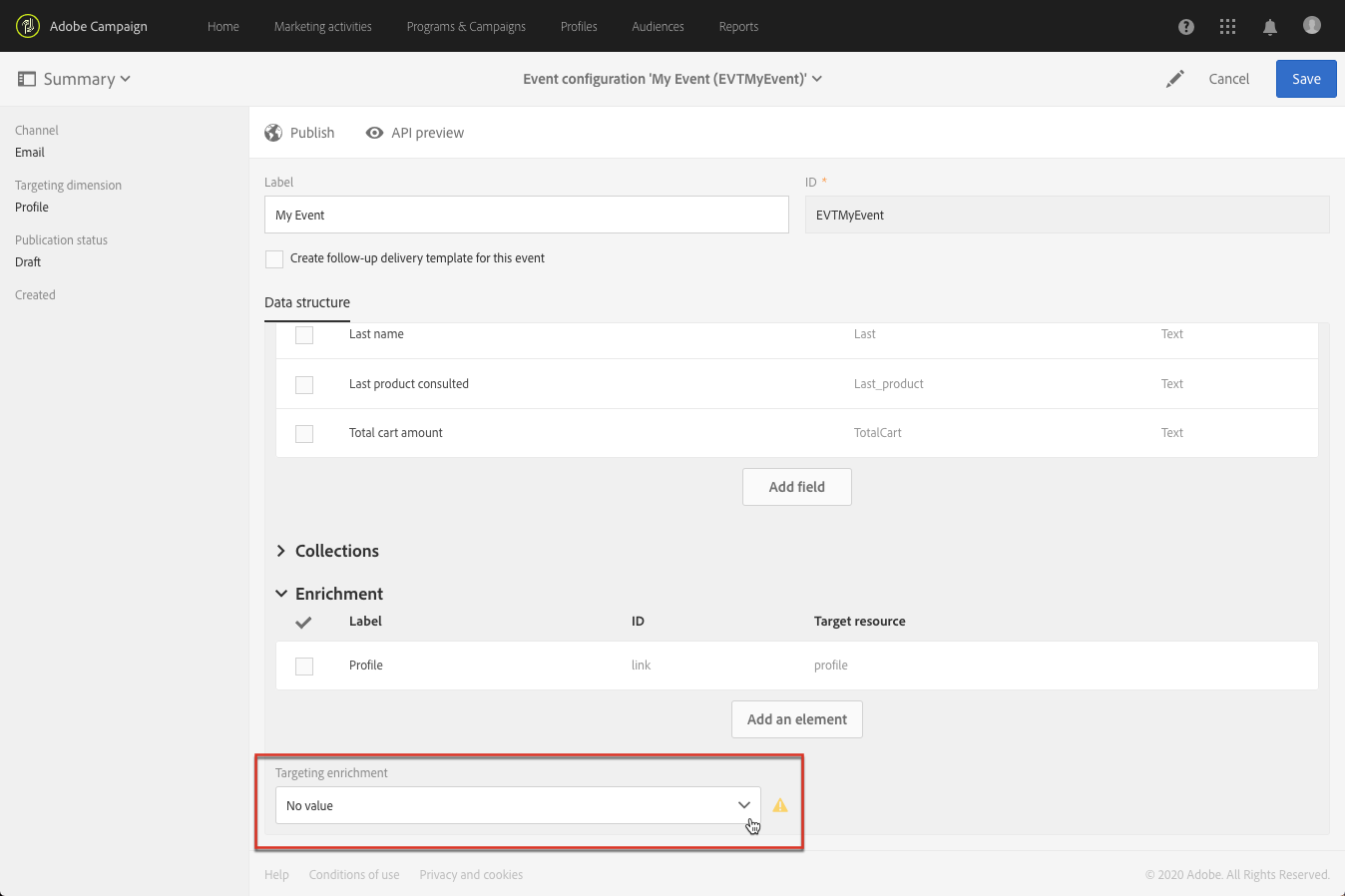 이벤트를 Profile 리소스( 이벤트 강화)을 선택하고 이 데이터 보강 을(를) (으)로 선택합니다 Targeting enrichment.