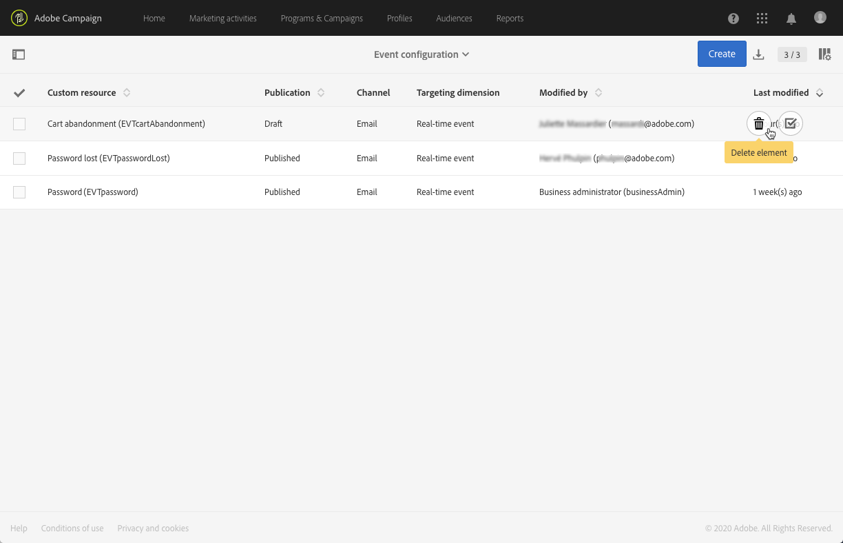 마우스를 원하는 이벤트 구성 위로 가져간 후 Delete element 버튼을 클릭합니다.