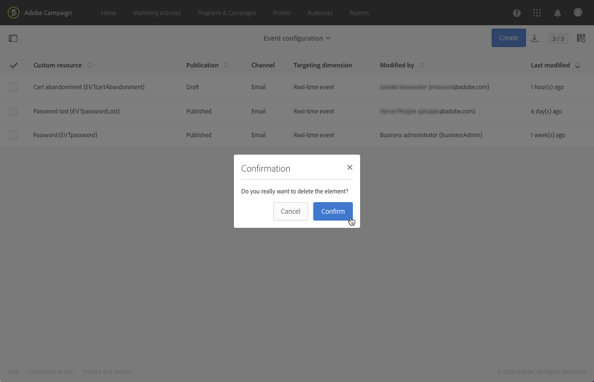 게시되어 이미 사용된 이벤트 구성을 삭제하면 해당 트랜잭션 메시지와 해당 전송 및 추적 로그도 삭제됩니다.