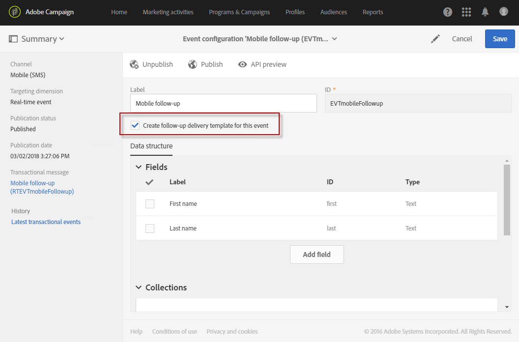 이벤트를 구성할 때 Create follow-up delivery template for this event 상자를 사용하여 이벤트를 게시합니다.