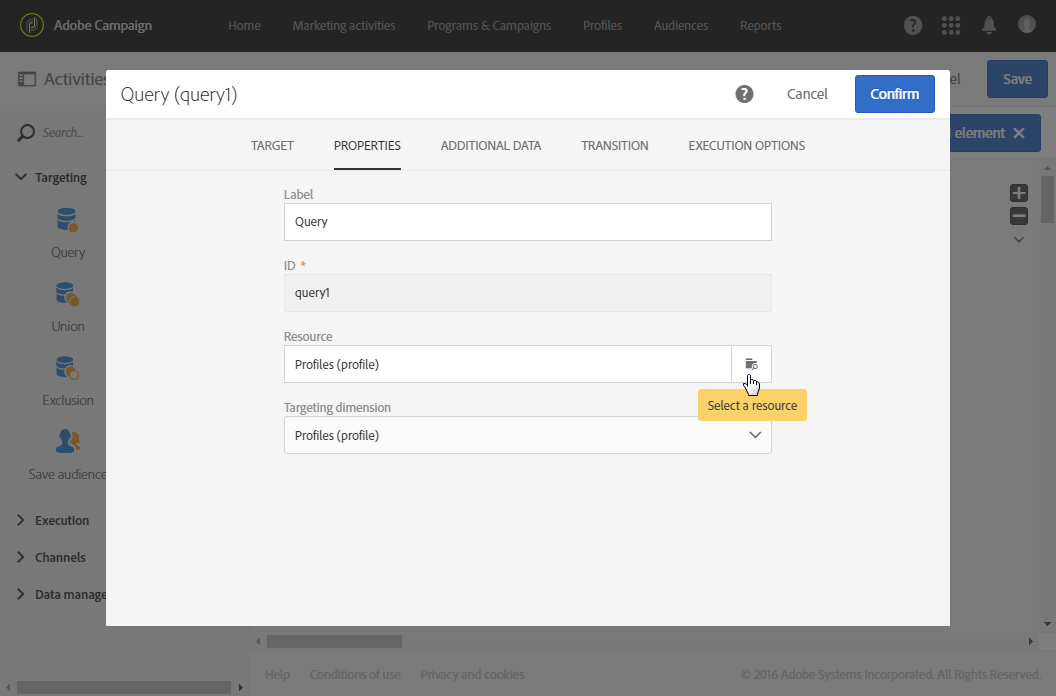 프로필 리소스 이외의 리소스에 대해 쿼리를 실행하려면 활동의 Properties 탭을 클릭하고 Resource 드롭다운 목록.