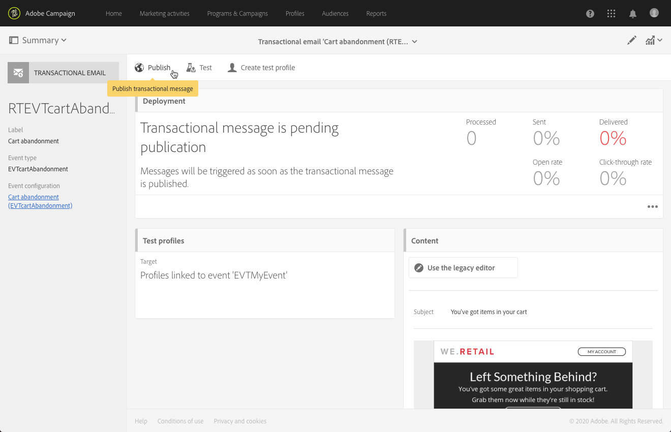 트랜잭션 메시지를 편집하고 테스트하면 게시할 수 있습니다. 을(를) 클릭하여 Publish 버튼을 클릭합니다.