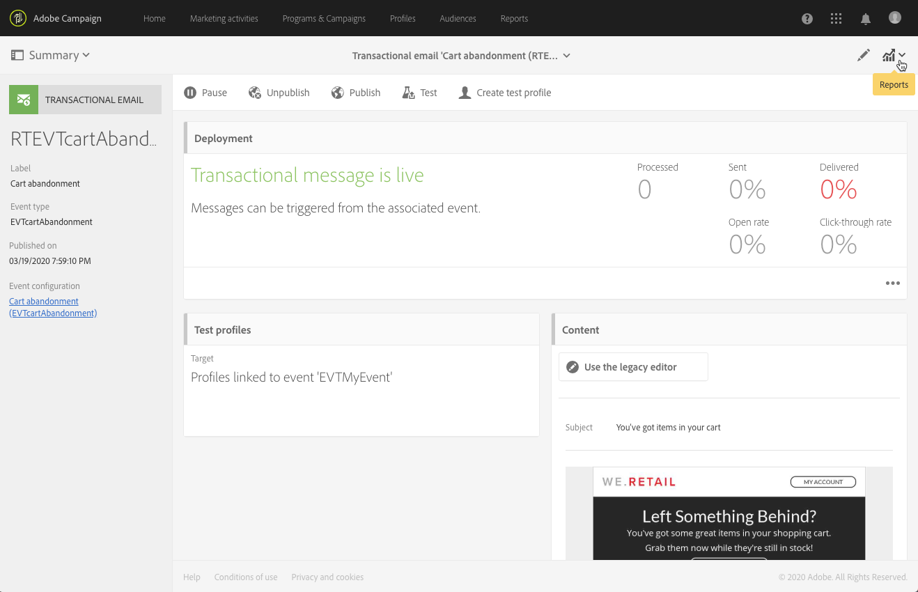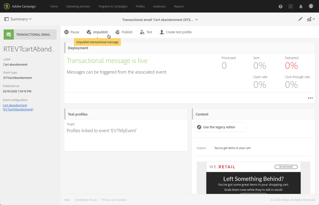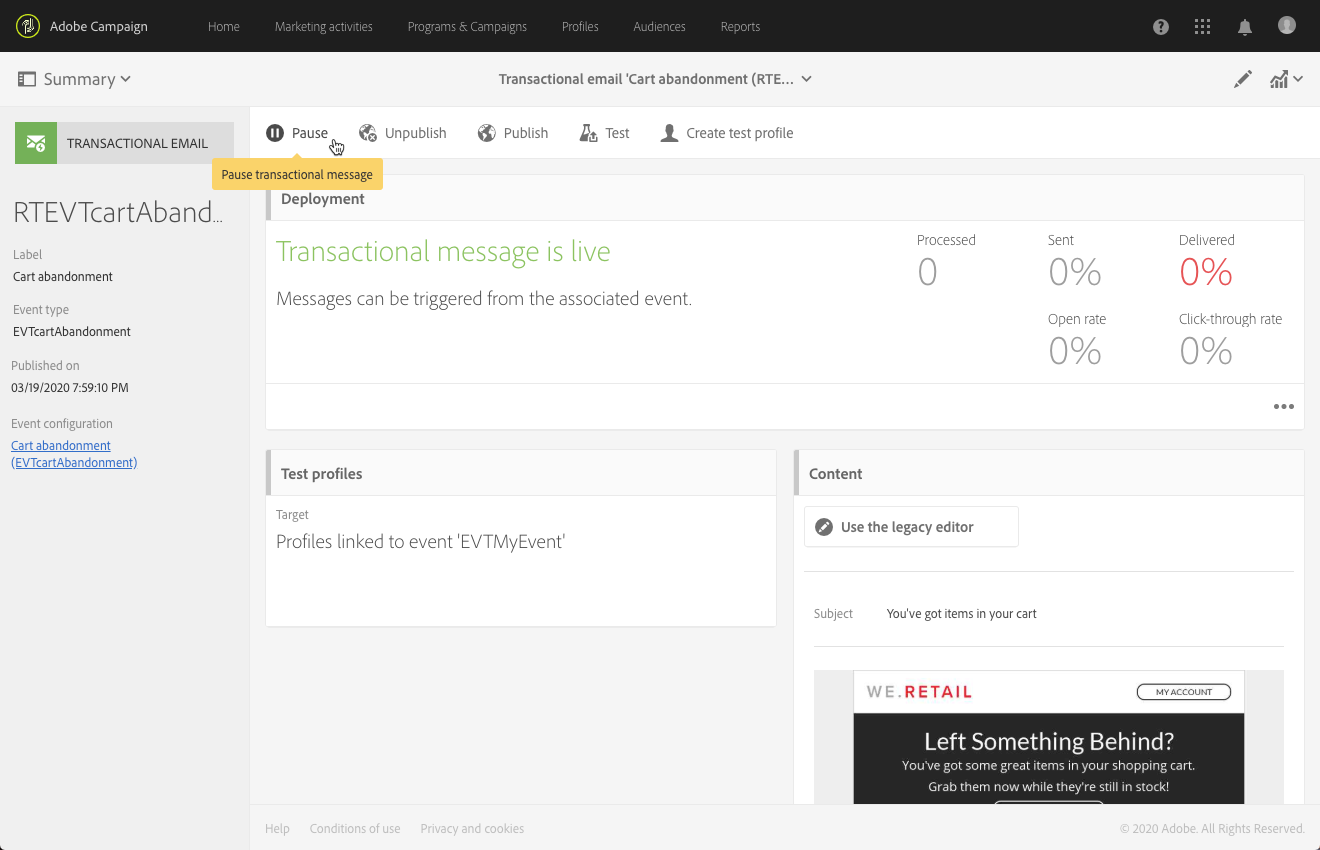 예를 들어 메시지에 포함된 데이터를 수정하기 위해 Pause 버튼을 사용하여 트랜잭션 메시지 게시를 일시 중단할 수 있습니다. 그러면 이벤트는 더 이상 처리되지 않고 대신 Adobe Campaign 데이터베이스의 큐에 보관됩니다.