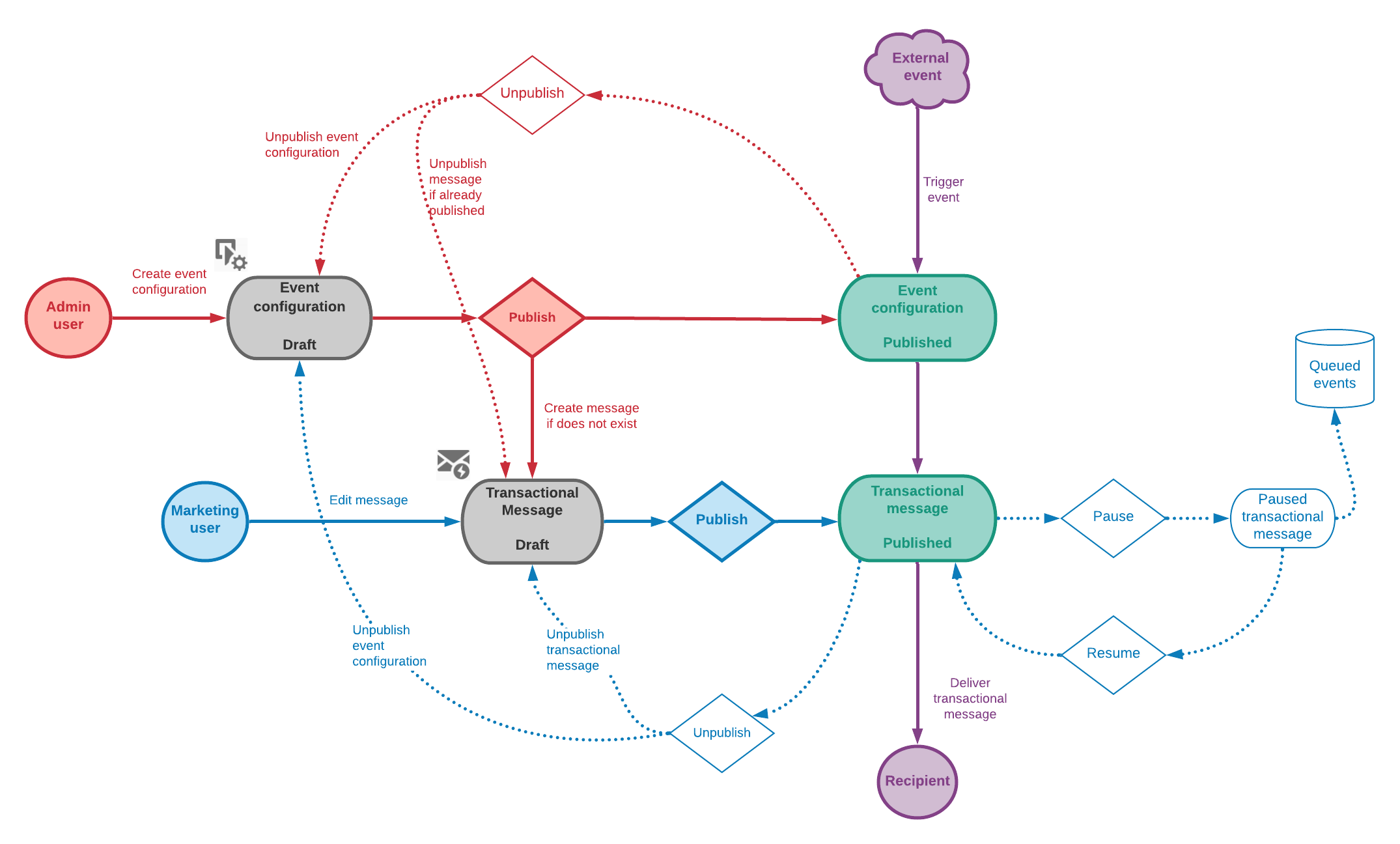 트랜잭션 메시지: 다른 트랜잭션 메시지가 해당 이벤트에 연결되어 있지 않는 한, 트랜잭션 메시지의 게시를 취소하는 경우, 트랜잭션 메시지를 성공적으로 삭제하려면 이벤트 구성도 게시 취소해야 합니다. 자세한 내용은 이벤트 게시 취소를 참조하십시오.