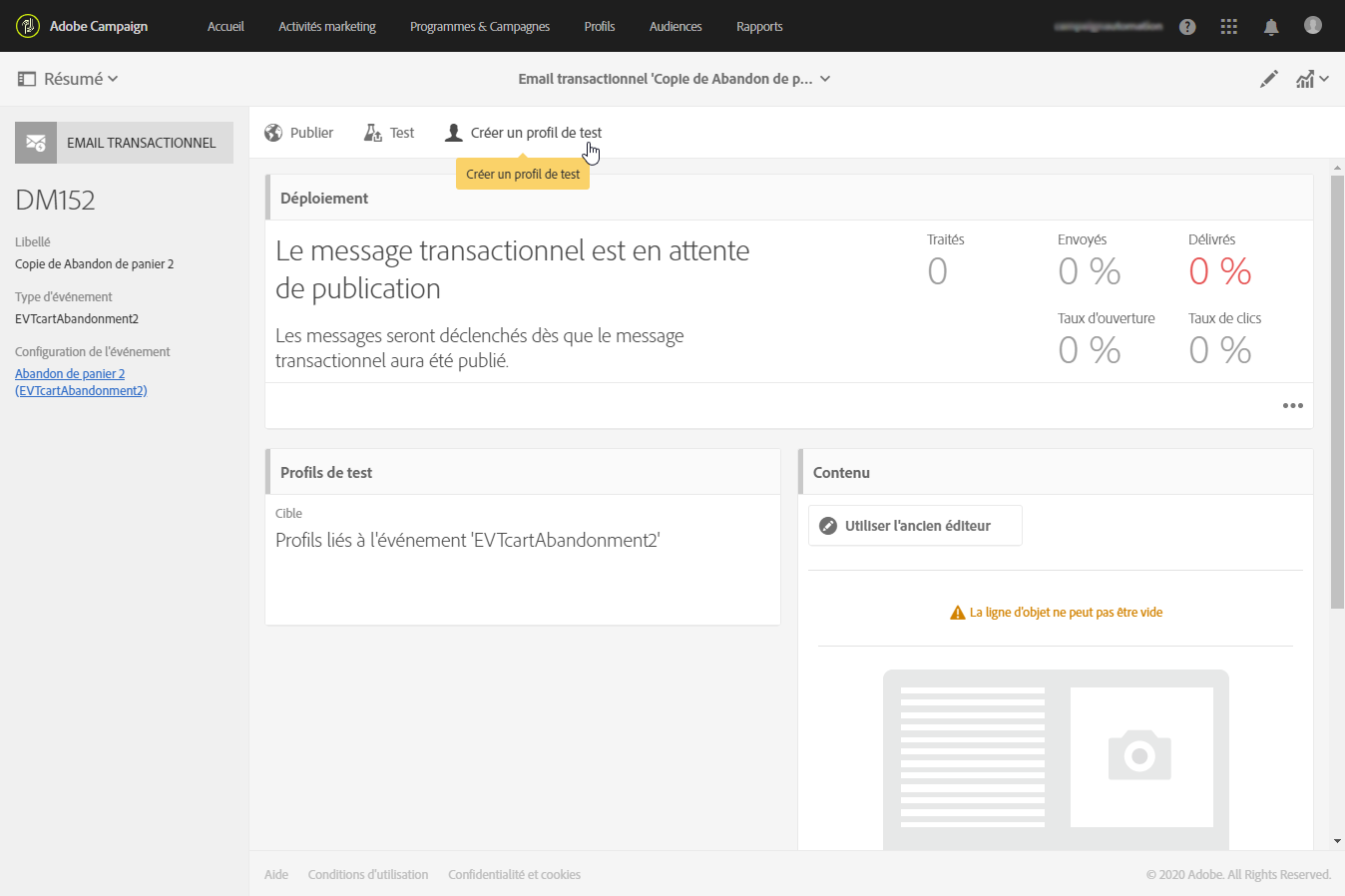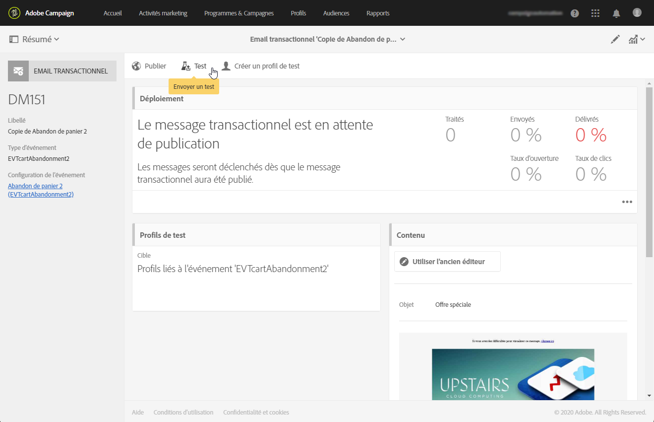 Avant de publier votre message transactionnel, vous pouvez créer un profil de test spécifique qui vous permettra de vérifier correctement le message.