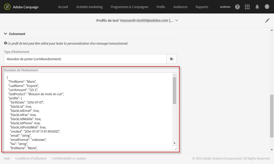 Indiquez les informations à transmettre au format JSON dans la section Données de l’événement utilisées pour la personnalisation. C’est le contenu qui sera utilisé lors de la prévisualisation du message et que recevra le profil de test à l’envoi du BAT.
