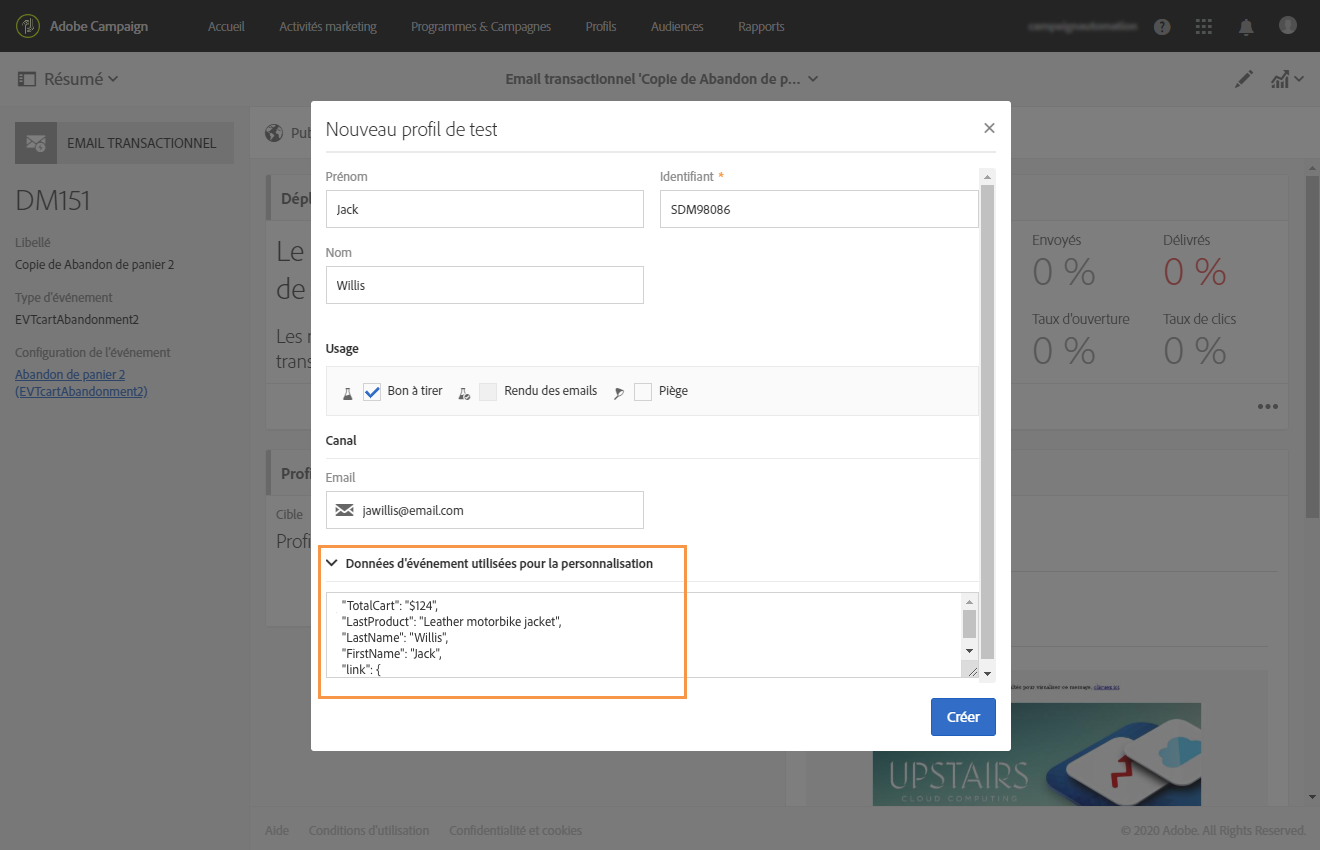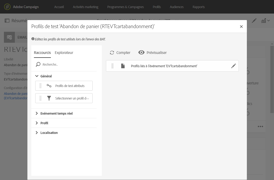 Définissez un profil de test qui sera lié à votre événement, ce qui vous permettra de prévisualiser votre message et d’envoyer un BAT approprié.