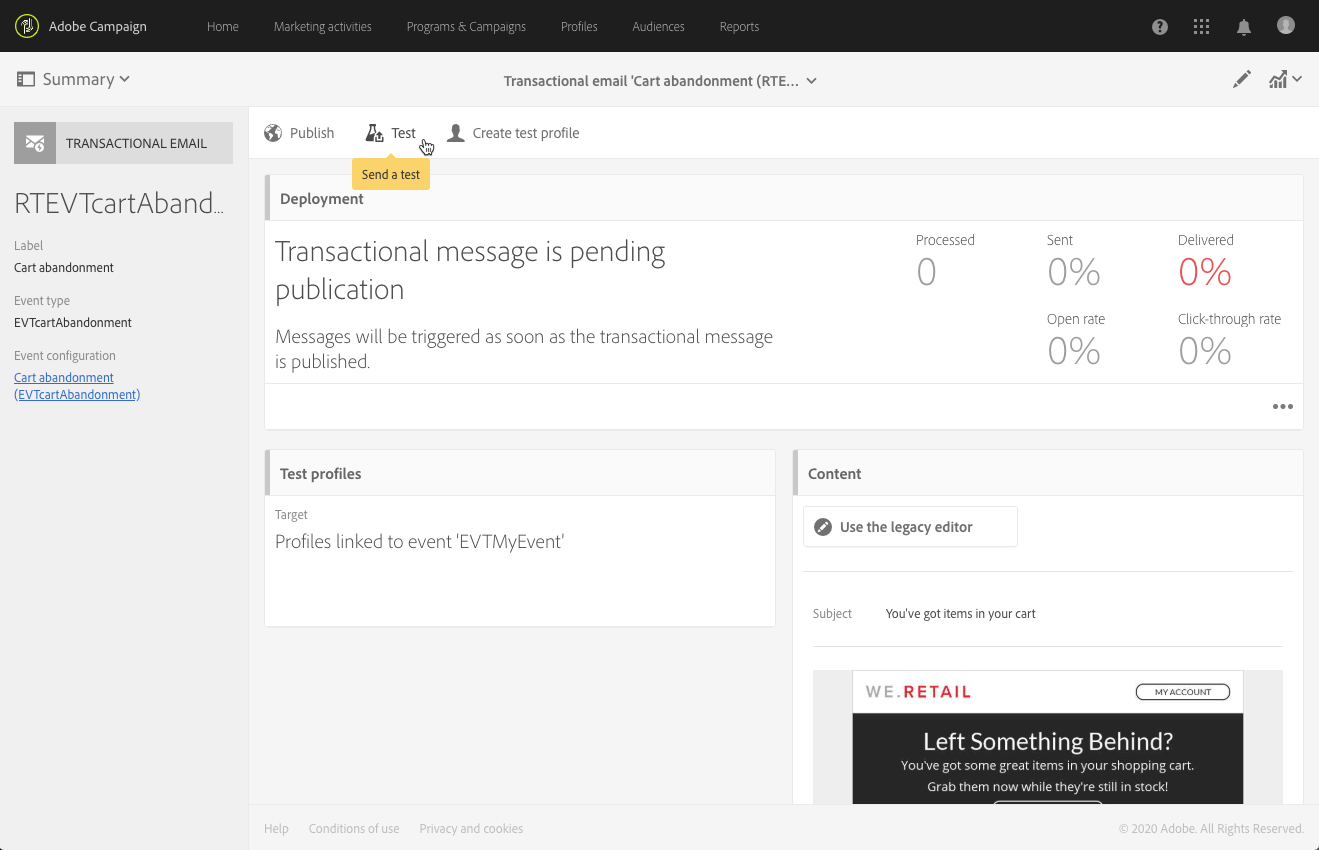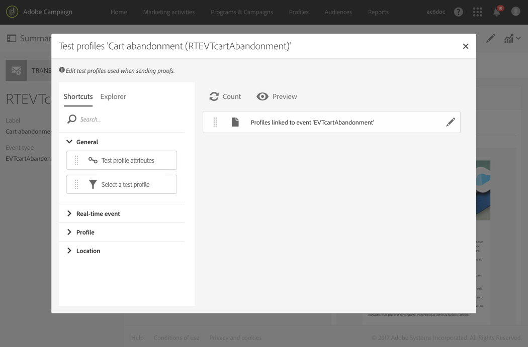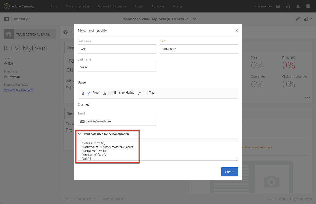 메시지를 미리 보고 관련 증명을 전송할 수 있는 이벤트에 연결할 테스트 프로필을 정의합니다.