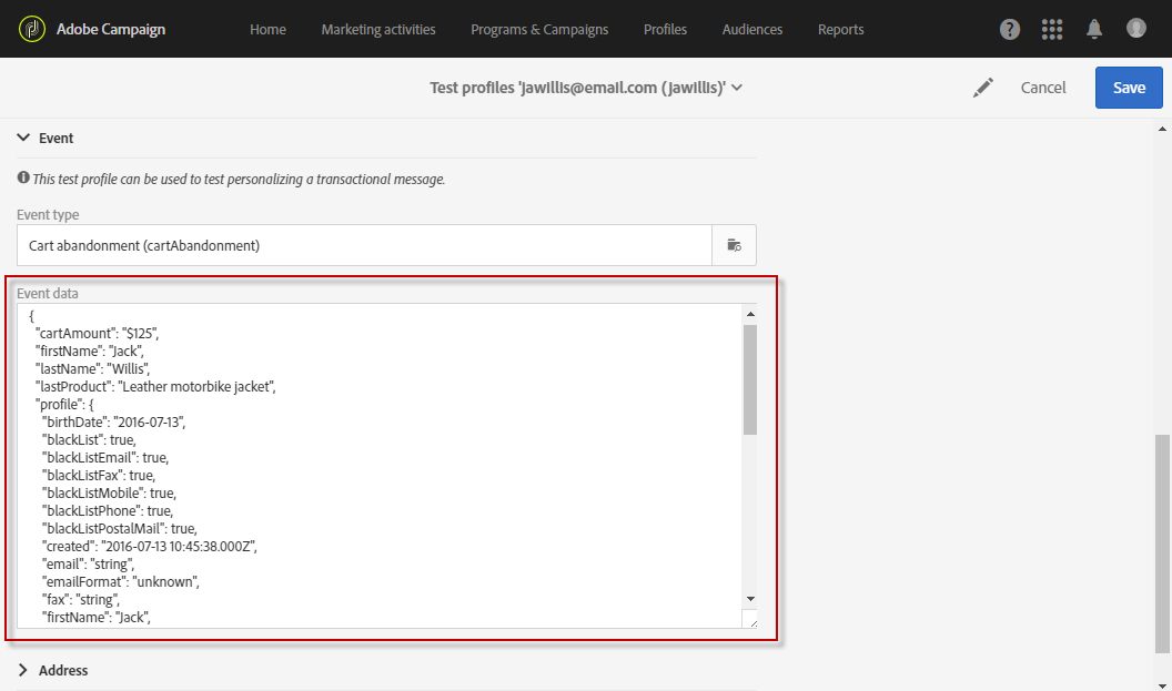 Event data used for personalization 섹션에서 JSON 형식으로 전송할 정보를 지정합니다. 메시지를 미리 볼 때와 테스트 프로필에서 증명를 받을 때 사용할 콘텐츠입니다.