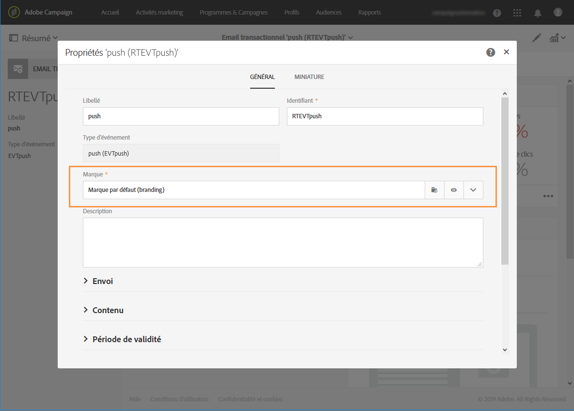 Lorsque vous éditez un message transactionnel, vous pouvez le lier à une marque pour appliquer automatiquement certains paramètres tels que le nom ou le logo de la marque. La Marque par défaut est sélectionnée par défaut dans les propriétés des messages transactionnels.