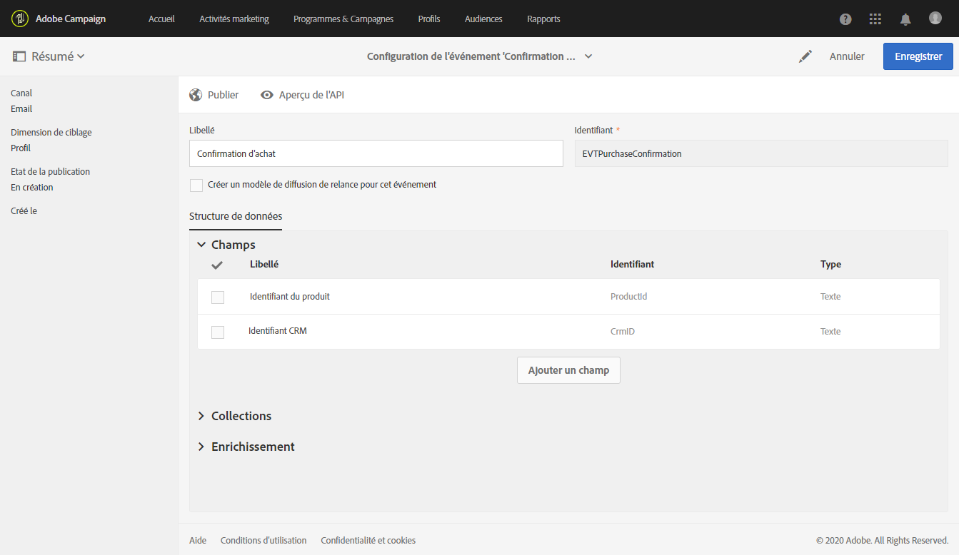 Définissez les attributs qui seront disponibles pour personnaliser le message transactionnel. Dans cet exemple, ajoutez les champs « Identifiant CRM » et « Identifiant produit ». Voir Définir les attributs d'événement.