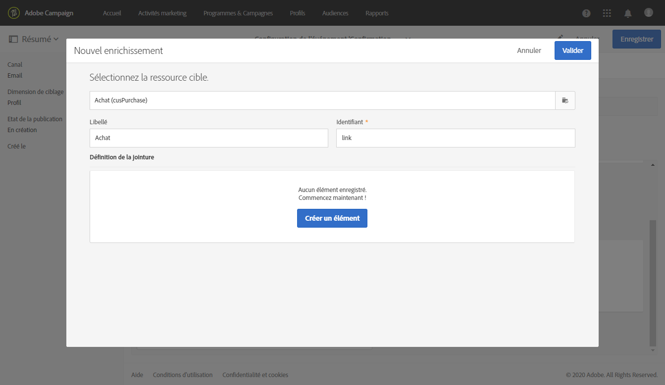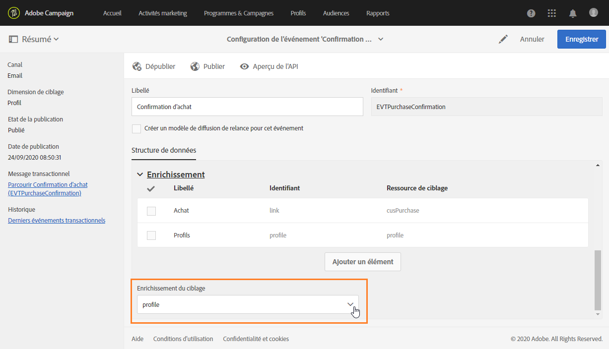 Comme il est obligatoire pour les événements basés sur un profil, vous devez également créer un enrichissement ciblant la ressource Profil.