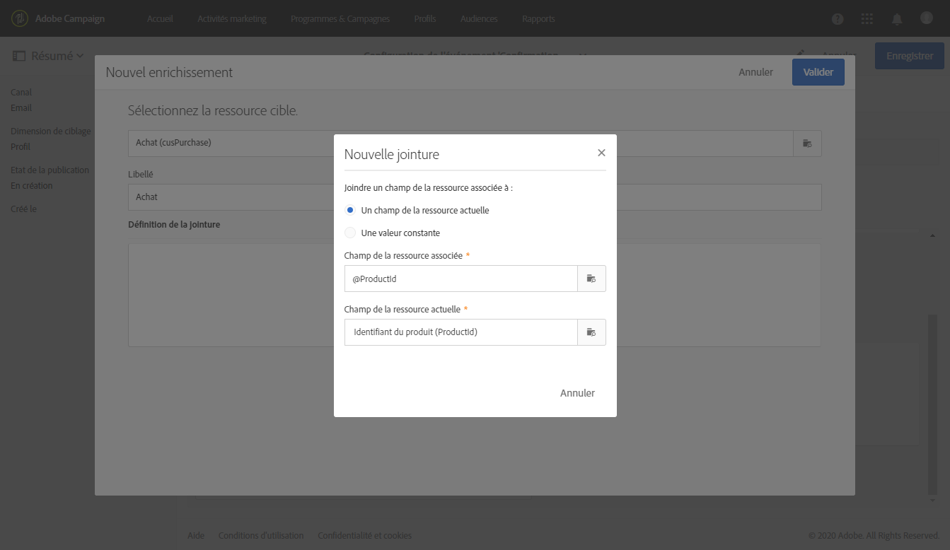Créez une condition de jointure entre le champ « Identifiant produit » ajouté précédemment au message et le champ correspondant dans la ressource Achat.