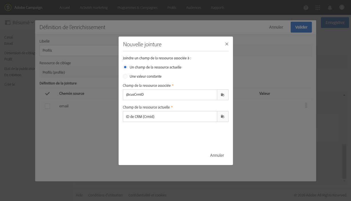 Créez une condition de jointure entre le champ « Identifiant produit » ajouté précédemment au message et le champ correspondant dans la ressource Profil que vous avez étendue.