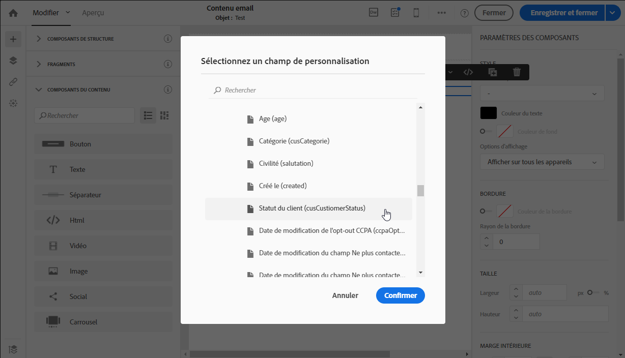 Grâce à la réconciliation avec le champ « Identifiant CRM » que vous avez ajouté à la ressource Profil, vous avez un accès direct à toutes les informations du profil pour personnaliser votre message.