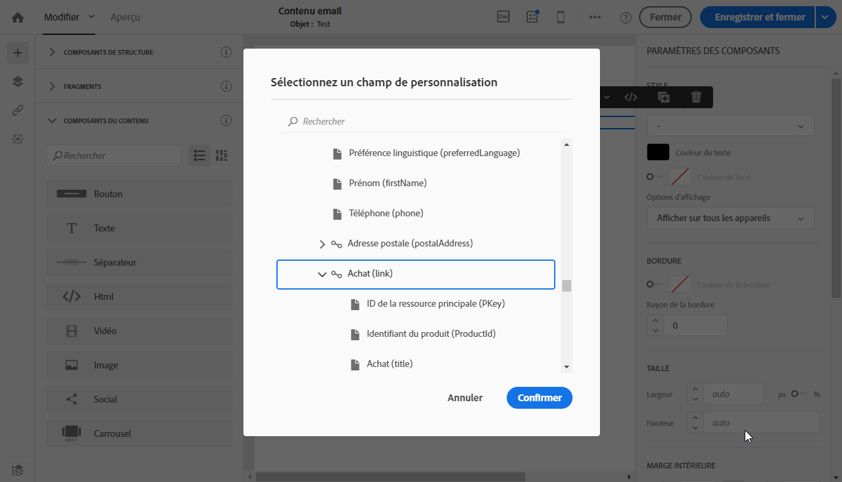 Pour ce faire, sélectionnez Insérer un champ de personnalisation dans la barre d’outils contextuelle. Dans le nœud Contexte > Événement transactionnel > Contexte d'événement, ouvrez le nœud correspondant à la ressource personnalisée Achat et sélectionnez un champ.