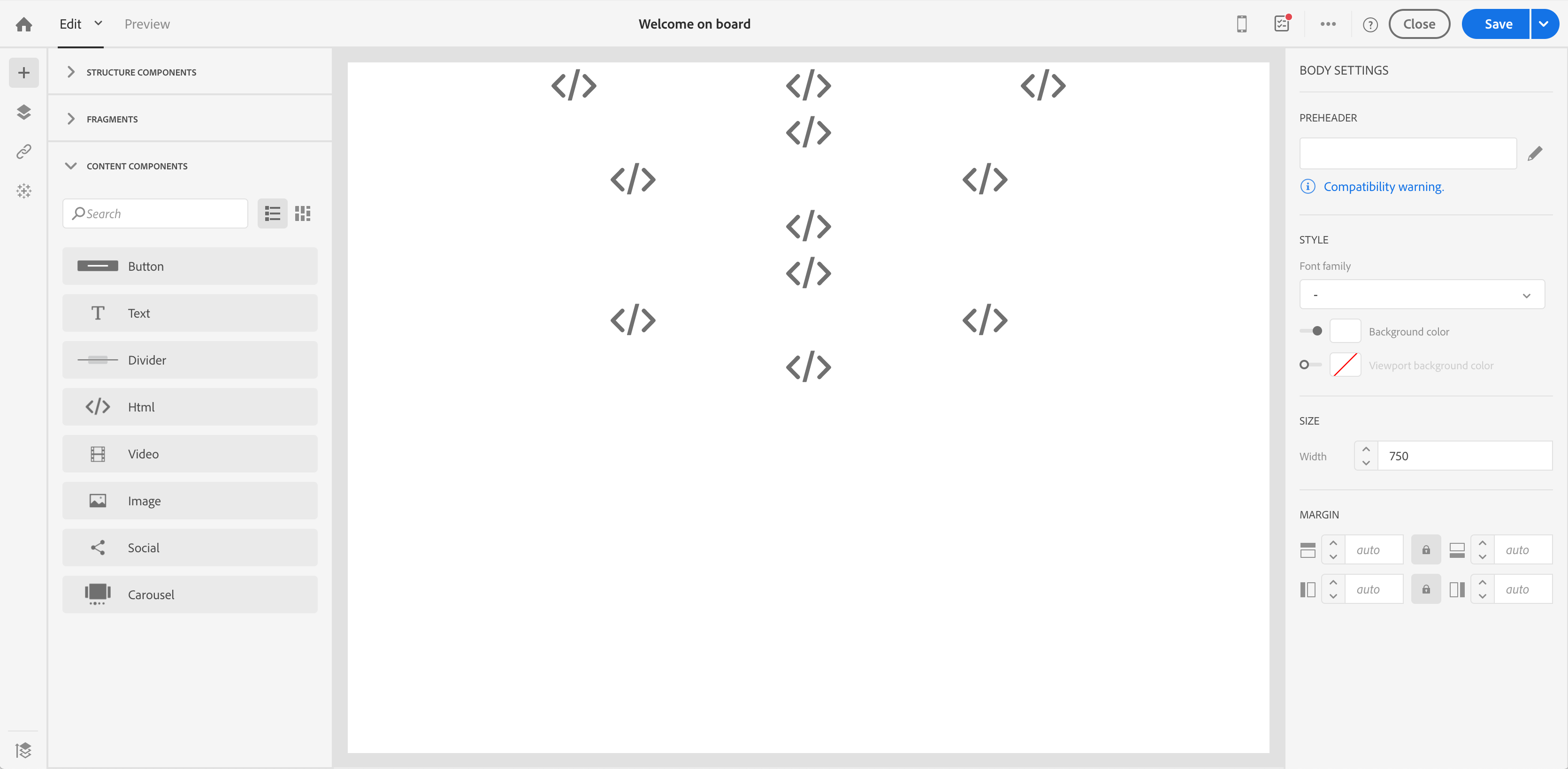 - Email Designer을(를) 열어 빈 전자 메일 콘텐츠를 만듭니다.