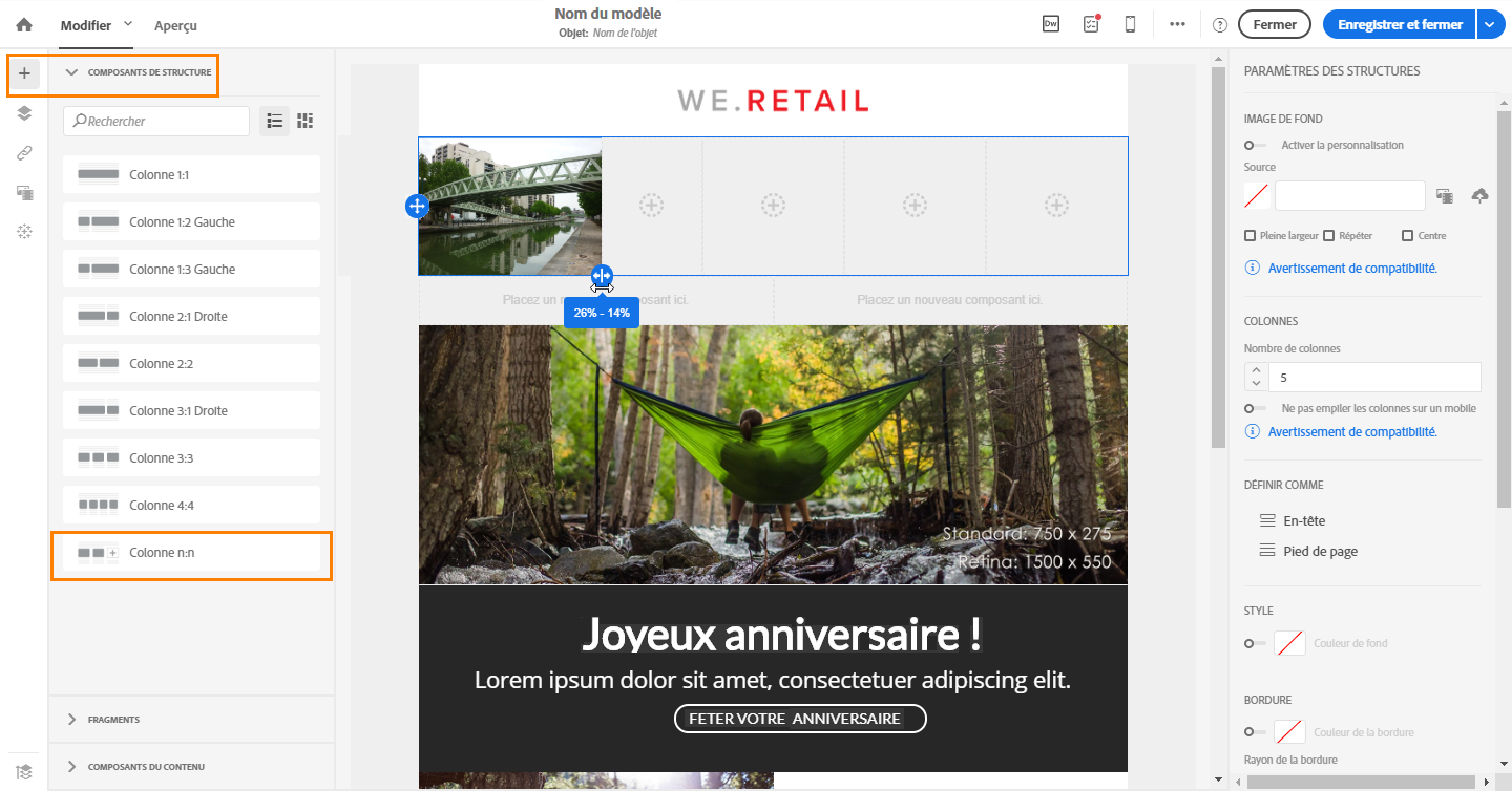 Sélectionnez le composant n:n colonne pour définir le nombre de colonnes de votre choix (entre 3 et 10). Vous pouvez aussi définir la largeur de chaque colonne en déplaçant les flèches situées au bas de celle-ci.
