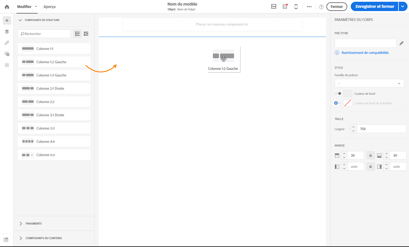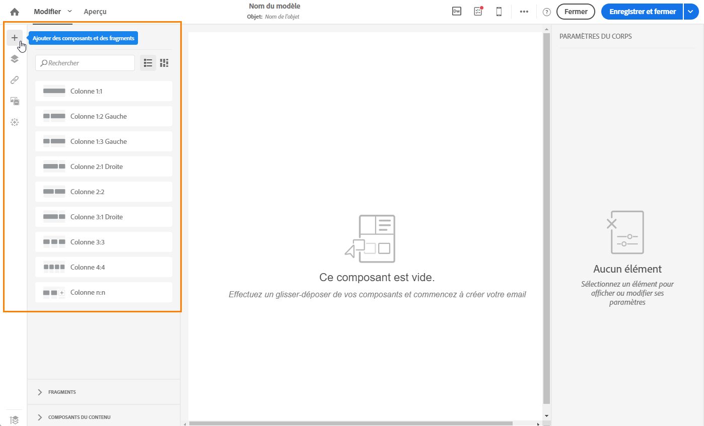 Lorsque la structure est définie, vous pouvez ajouter des fragments de contenu et des composants à votre email.