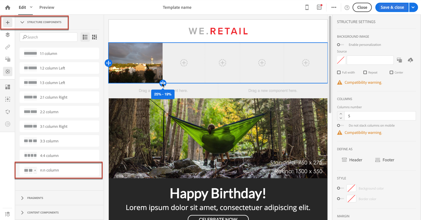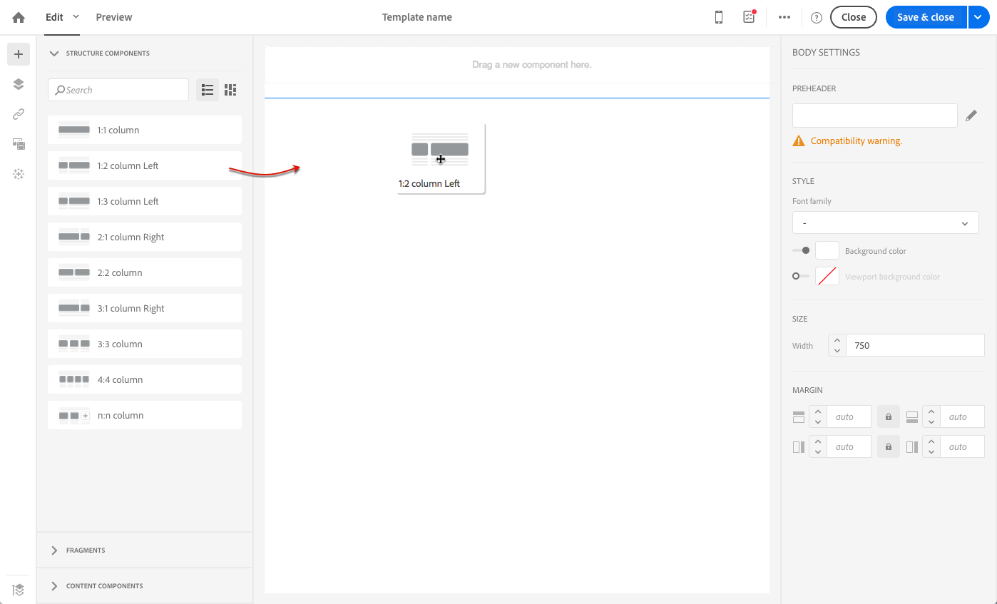 구조가 정의되면 컨텐츠 조각 및 구성 요소를 이메일에 추가할 수 있습니다.