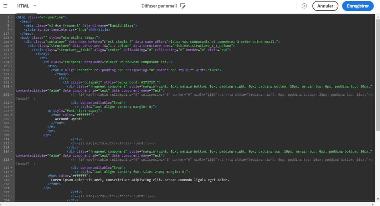 Pour les utilisateurs les plus expérimentés et pour des raisons de débogage, vous pouvez afficher et éditer le contenu de l'email directement dans la version HTML.