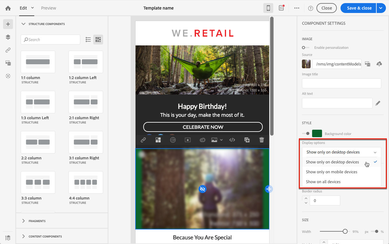 모바일 장치에 표시될 때 구성 요소를 숨길 수 있습니다. 이렇게 하려면 Display options 에서 Show only on desktop devices 을(를) 선택합니다.