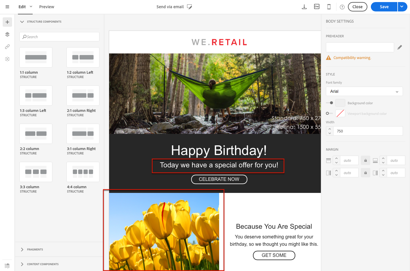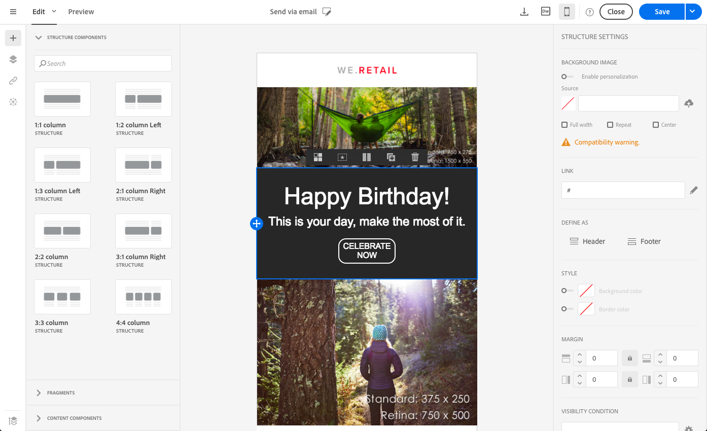 이메일을 만들고 콘텐츠 편집을 시작합니다. 자세한 내용은 처음부터 이메일 콘텐츠 디자인을 참조하세요.
