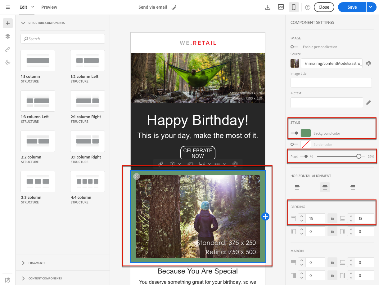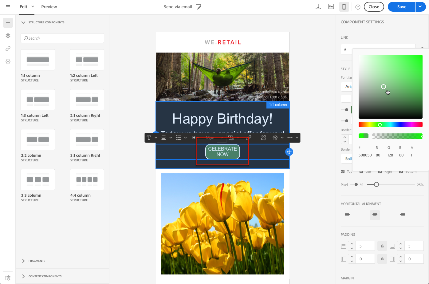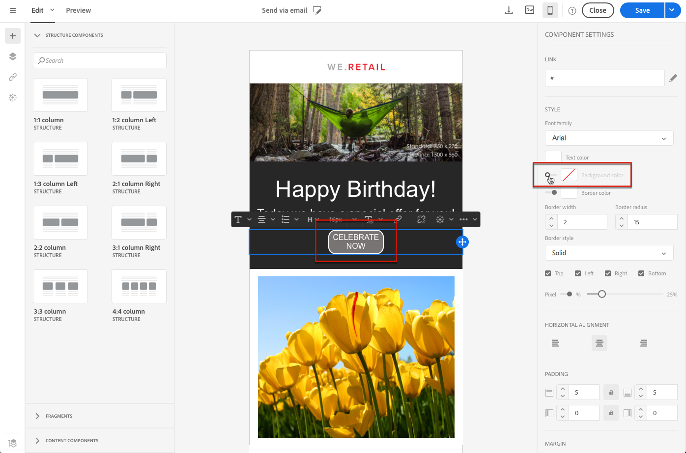모바일 표시에 대한 모든 스타일 옵션을 별도로 편집하여 이메일의 반응형 디자인을 세밀하게 조정할 수 있습니다. 예를 들어 여백과 패딩을 조정하거나, 더 작거나 더 큰 글꼴 크기를 사용하거나, 단추를 변경하거나, 전자 메일의 모바일 버전에 따라 다른 배경색을 적용할 수 있습니다.