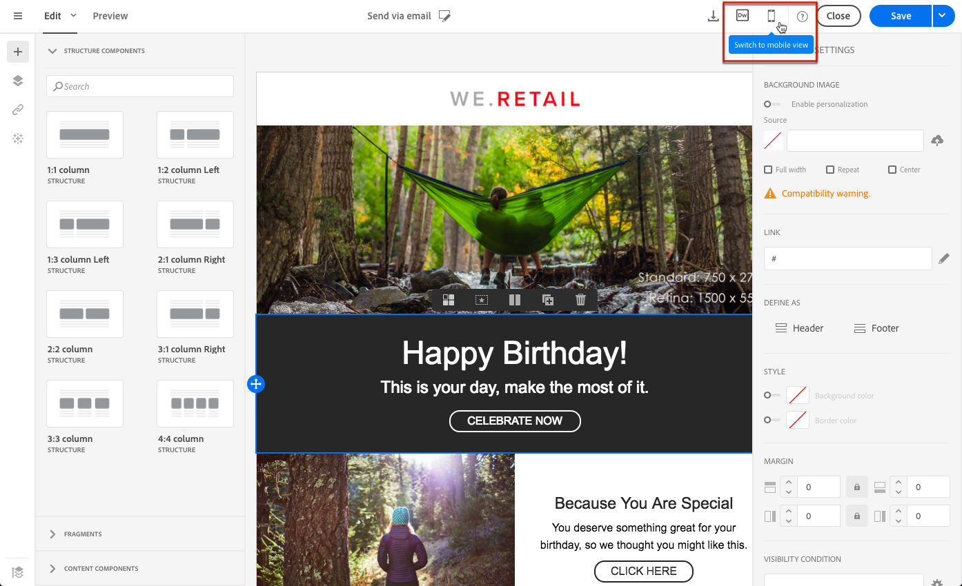 您可以個別編輯行動顯示的所有樣式選項,微調電子郵件的回應式設計。 例如,您可以調整邊界與邊框間距、使用較小或較大的字型大小、變更按鈕,或套用您的電子郵件行動版本所特有的不同背景顏色。