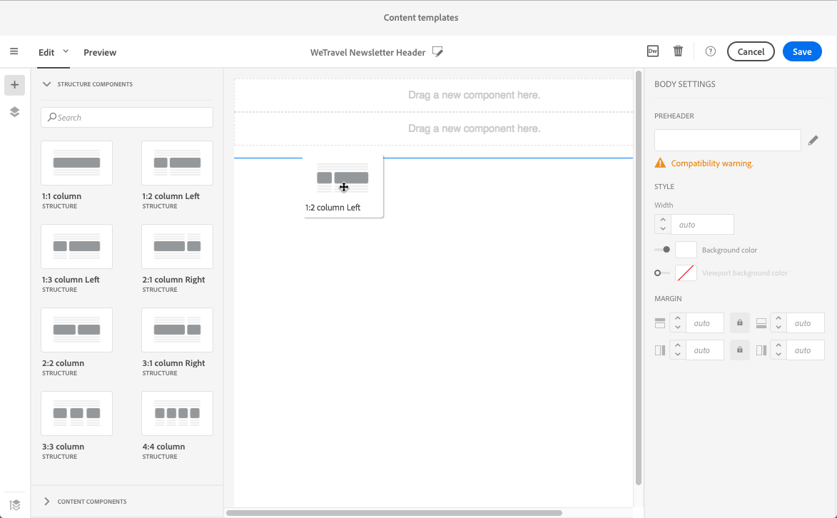 조각이나 콘텐츠 구성 요소를 팔레트에서 이메일의 구조 구성 요소로 끌어다 놓습니다.