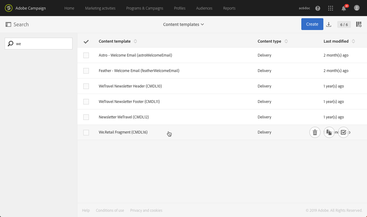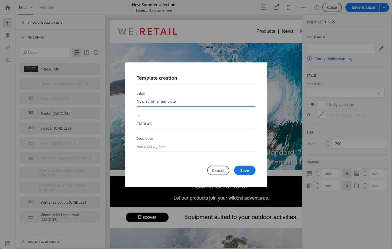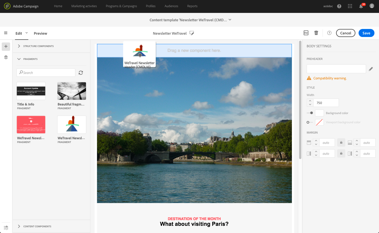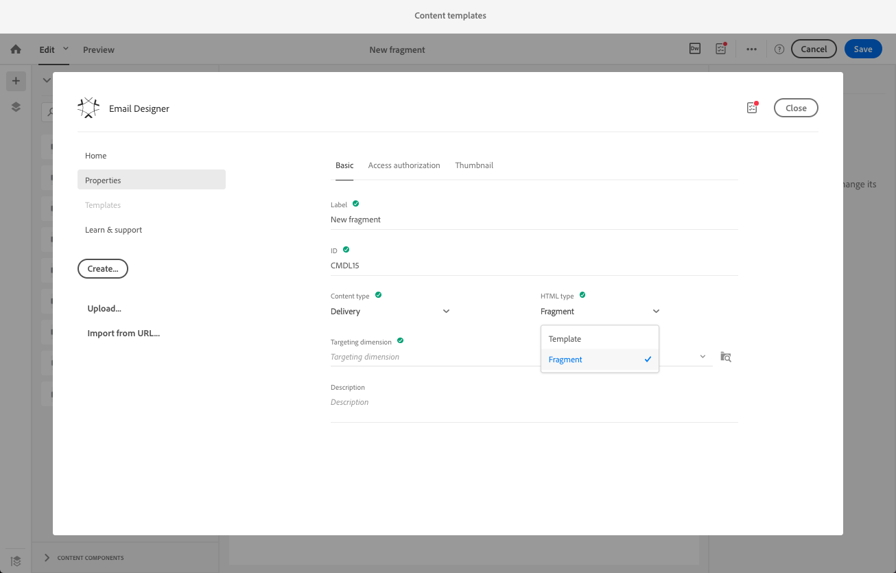Adobe Campaign에서 Resources > Content templates & fragments(으)로 이동하여 헤더에 대한 조각을 만듭니다. 자세한 내용은 콘텐츠 조각 만들기를 참조하세요.