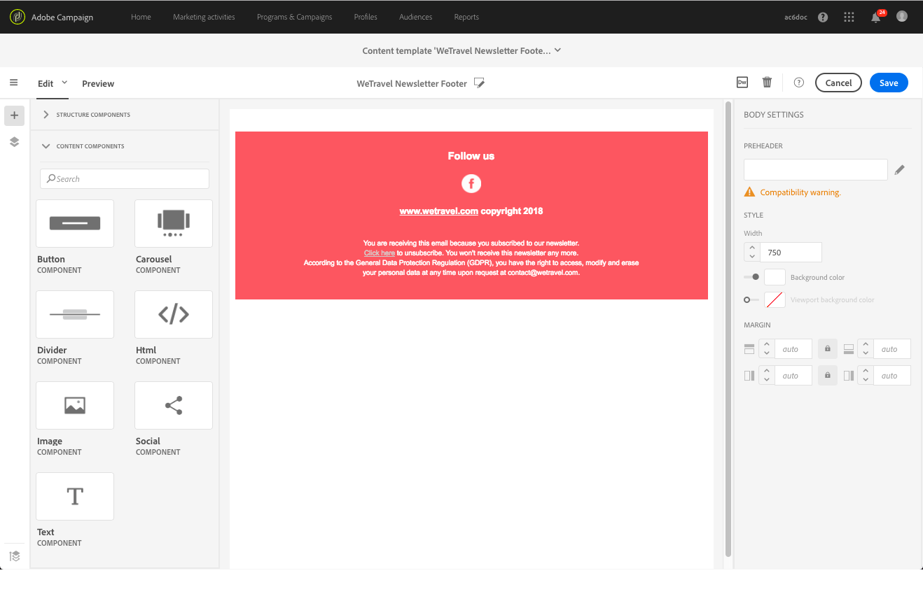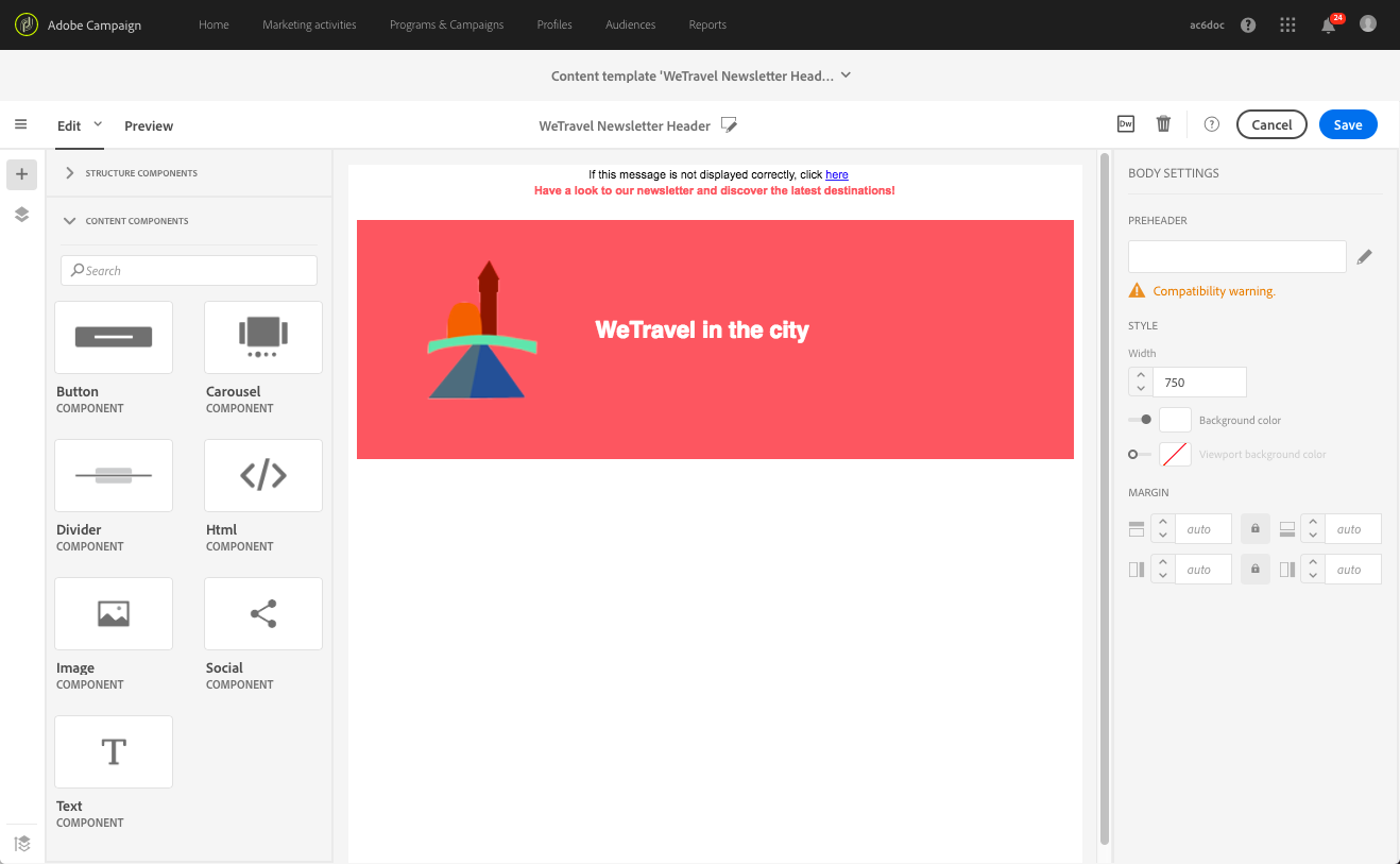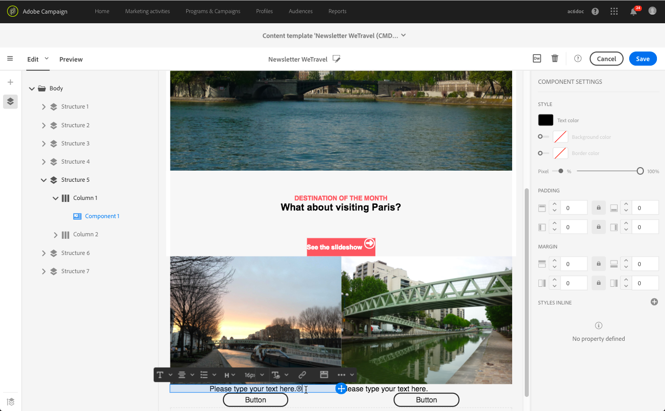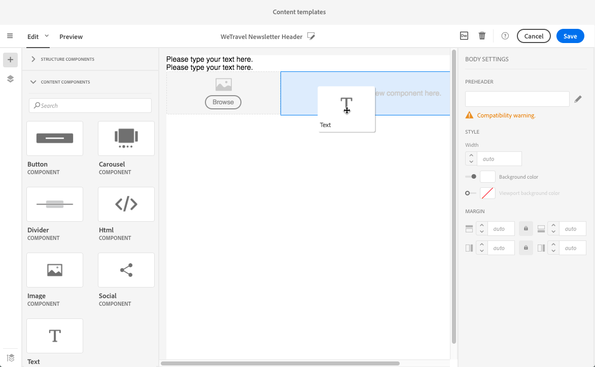 이메일 콘텐츠를 정의하기 위해 미리 배치한 구조 구성 요소에 콘텐츠 요소를 추가할 수 있습니다. 전자 메일 구조 편집을 참조하세요.