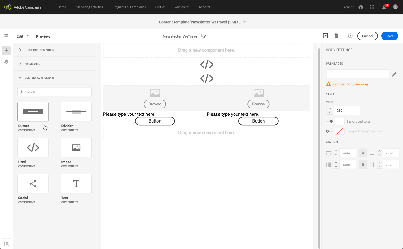 HTML Adobe 코드에 익숙하다면 원본 전자 메일의 보다 복잡한 요소를 복사하여 붙여 넣을 수 있는 Html 구성 요소를 활용하는 것이 좋습니다. 나머지 콘텐츠에는 Button, Image 또는 Text 과(와) 같은 다른 구성 요소를 사용하십시오. 자세한 내용은 콘텐츠 구성 요소 정보를 참조하세요.
