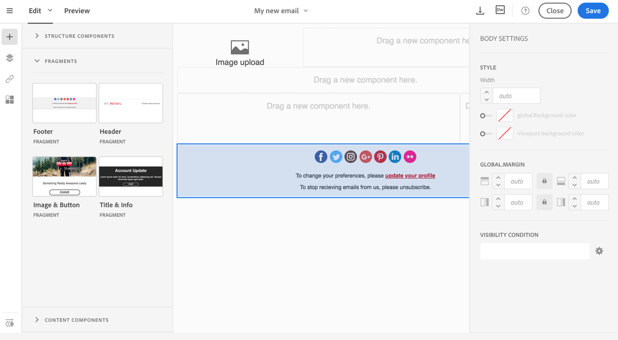 템플릿에 이메일 머리글, 바닥글 및 본문에 해당하는 여러 구조 구성 요소를 삽입합니다. 구조 구성 요소를 추가하는 방법에 대한 자세한 내용은 전자 메일 Designer으로 전자 메일 구조 편집을 참조하십시오.