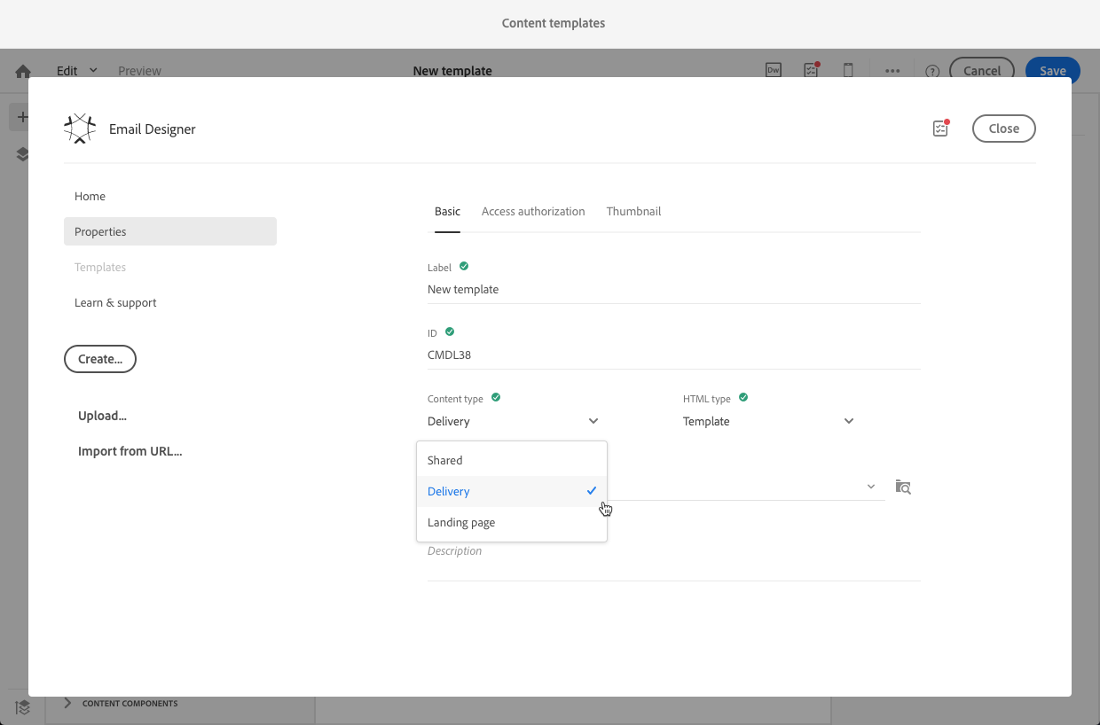 - Content type 드롭다운 목록에서 Shared 또는 Delivery 선택