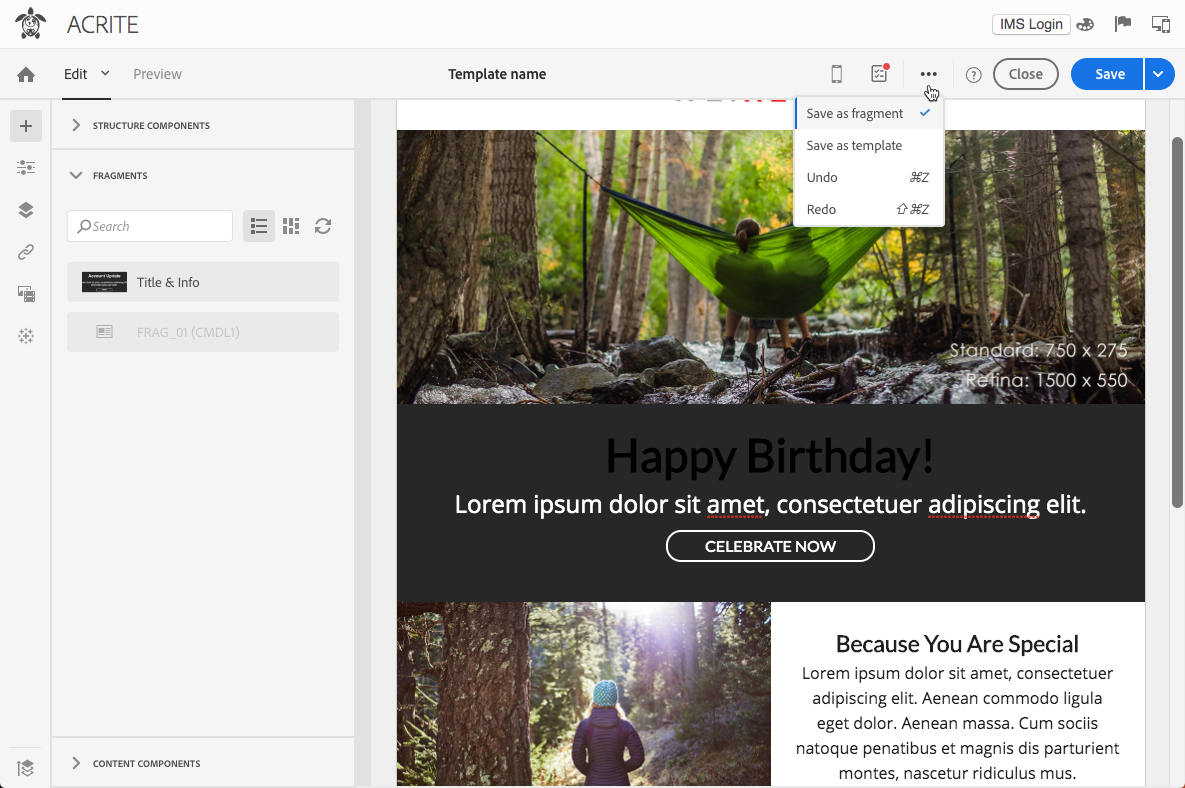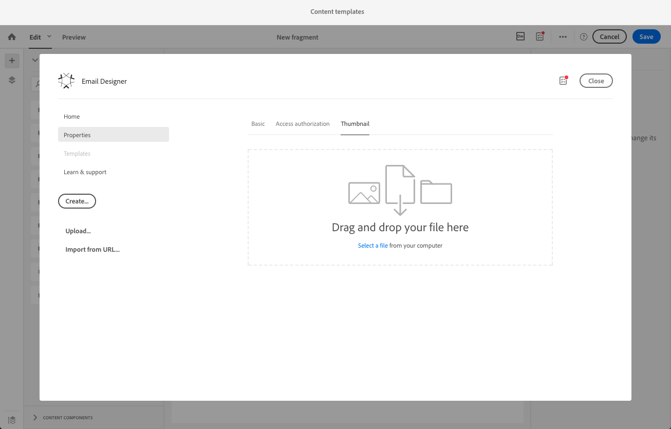 이메일 Designer으로 콘텐츠를 편집할 때 콘텐츠를 조각 또는 템플릿으로 저장하여 콘텐츠 템플릿을 만들 수도 있습니다. 자세한 내용은 콘텐츠를 템플릿으로 저장 및 콘텐츠를 조각으로 저장을 참조하십시오.