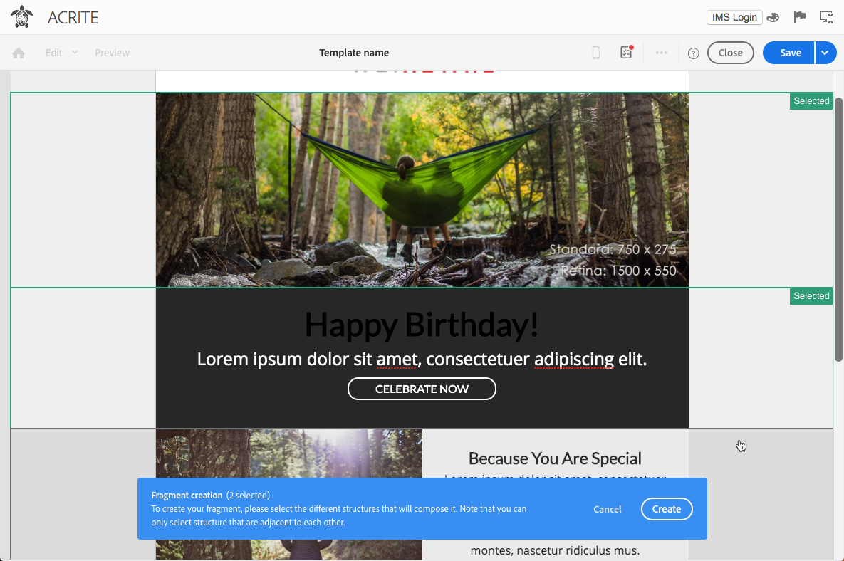 - 개인화 필드, 다이내믹 콘텐츠 또는 다른 조각이 포함된 구조를 조각으로 저장할 수 없습니다.