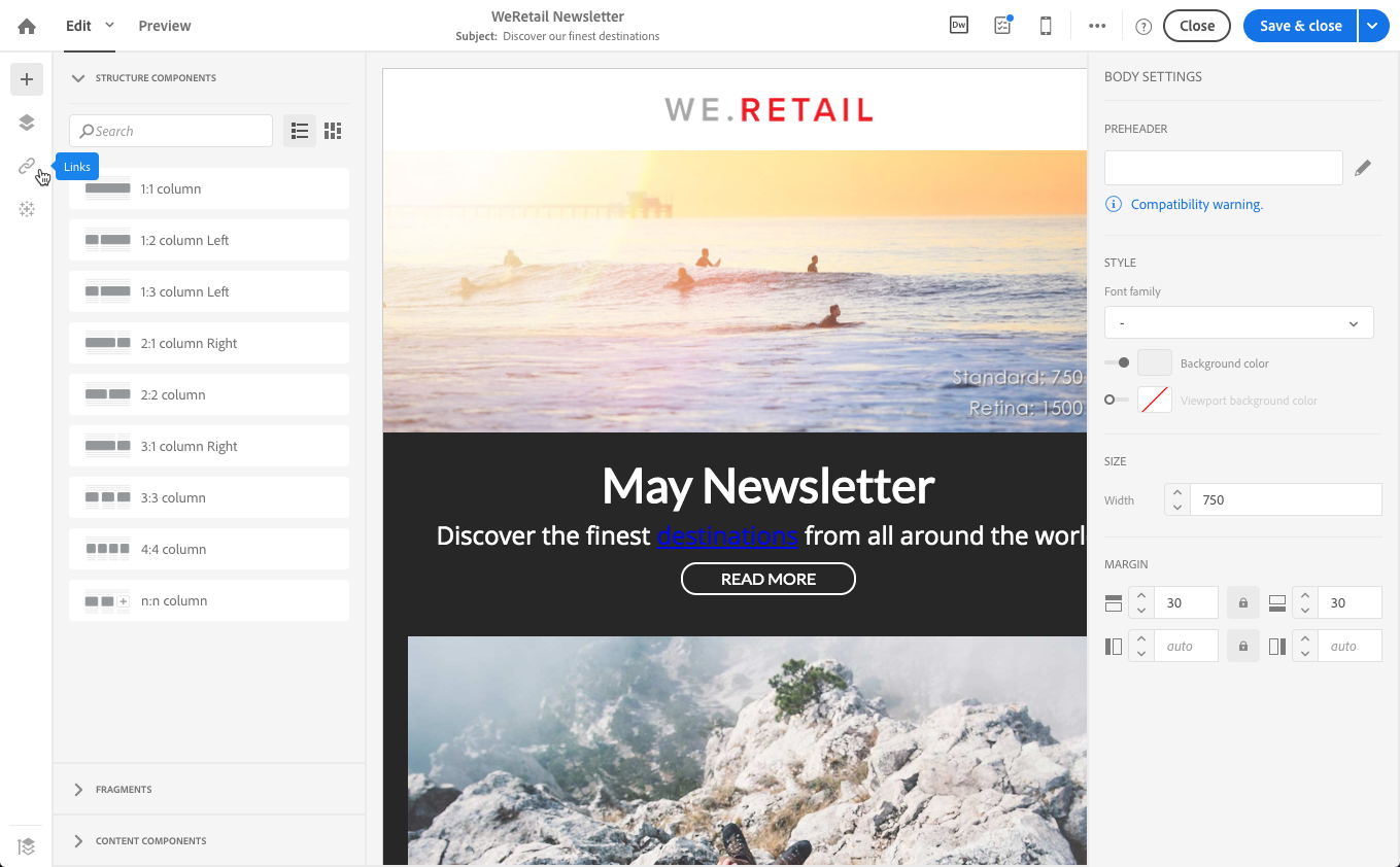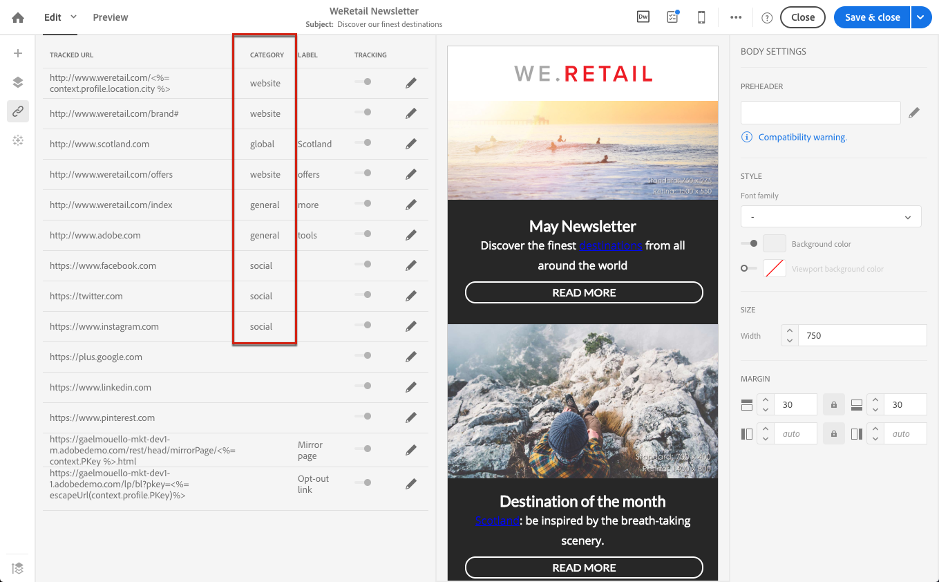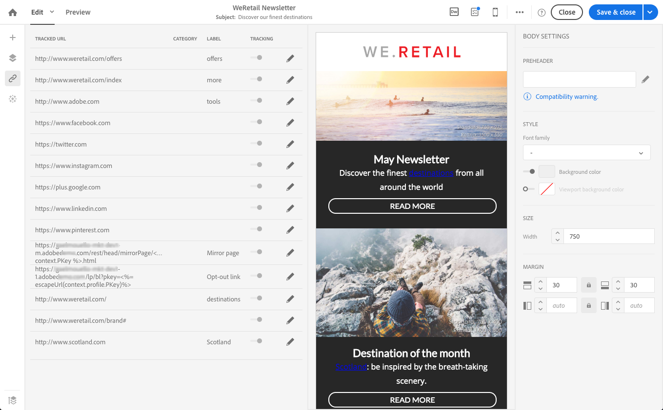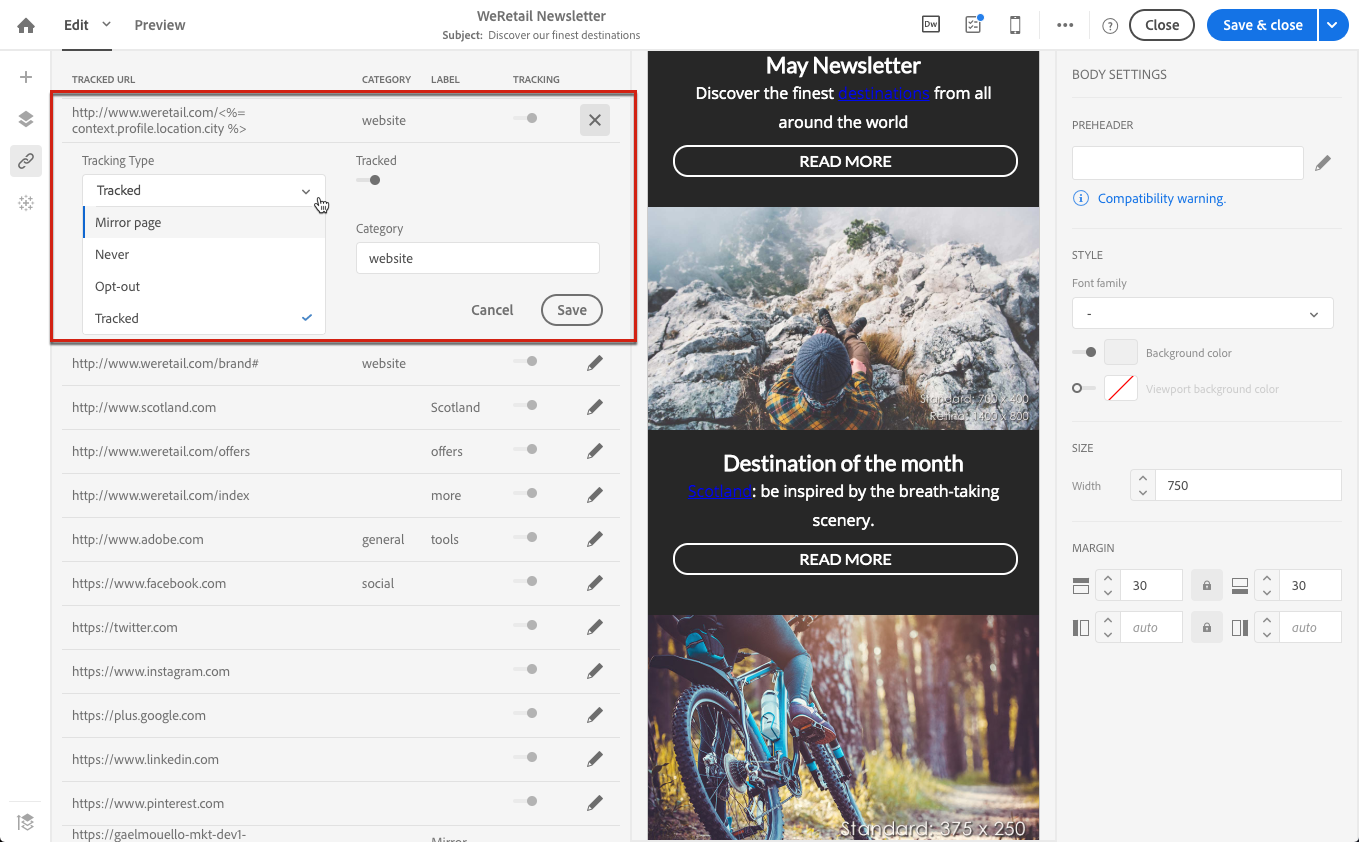 을(를) 사용하여 이메일을 편집할 때 이메일 디자이너를 채울 경우 이메일에 포함된 모든 URL을 나열하는 테이블에서 만든 링크에 쉽게 액세스하고 수정할 수 있습니다. 이 목록을 사용하면 중앙 집중식 보기를 사용하고 이메일 콘텐츠에서 각 URL을 찾을 수 있습니다. 액세스하려면 다음을 참조하십시오 추적된 URL 정보.