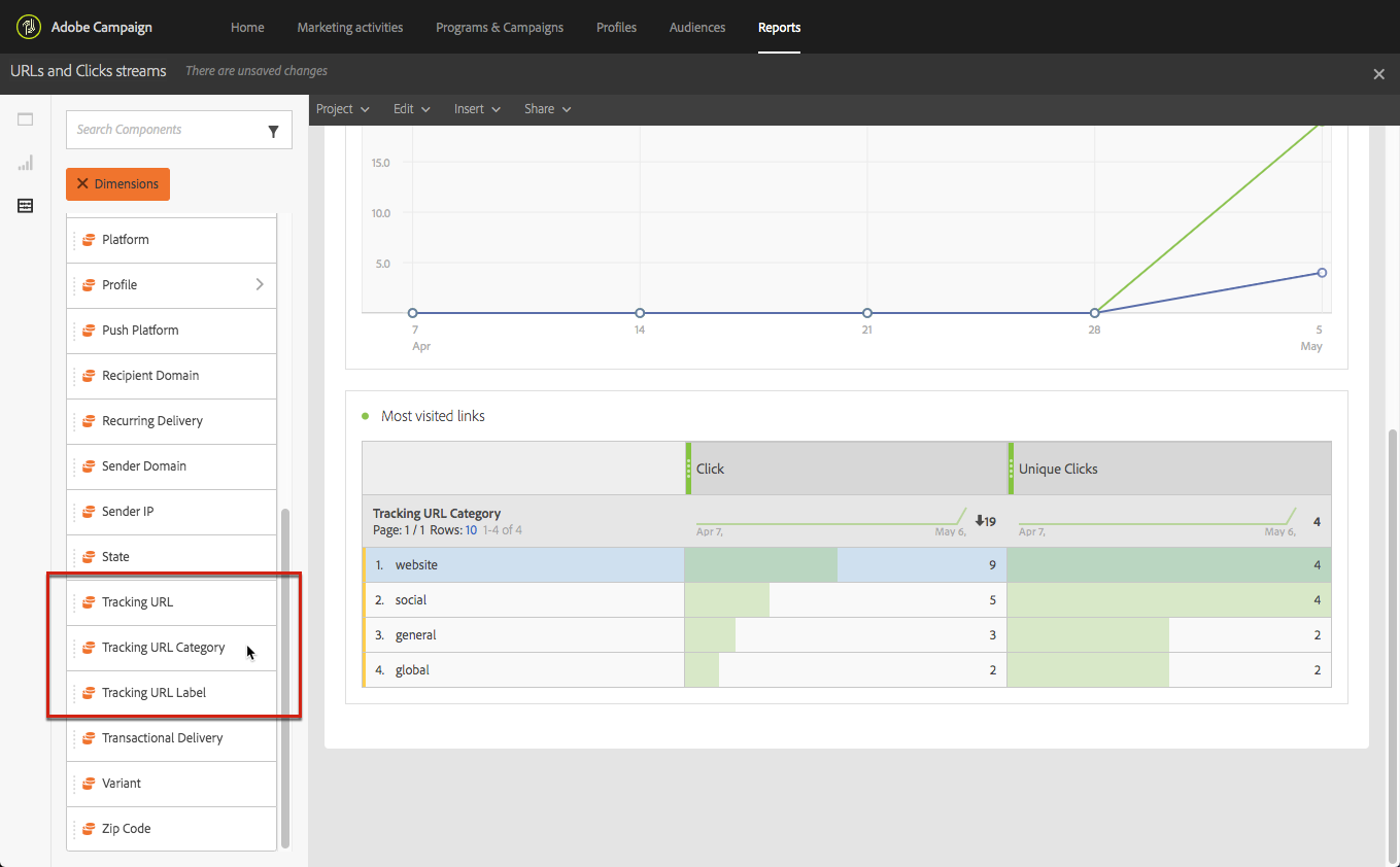 보고서를 작성할 때, Components 탭, 선택 Dimension 및 목록 아래로 스크롤하여 추적 구성 요소에 액세스합니다. 예를 들어 끌어서 놓습니다 Tracking URL Category 를 작업 공간으로 가져온 후 클릭한 각 URL의 추적 카테고리에 따라 결과를 표시합니다.