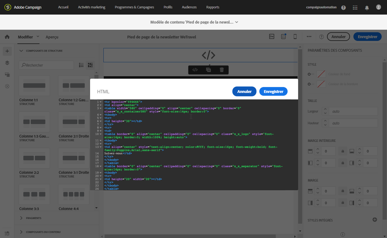 Si vous voulez créer un framework de fragments et de modèles modulaires qui peuvent être associés afin d'être réutilisés dans plusieurs emails, vous devriez envisager de convertir le code HTML de votre email en modèle de Concepteur d'email.