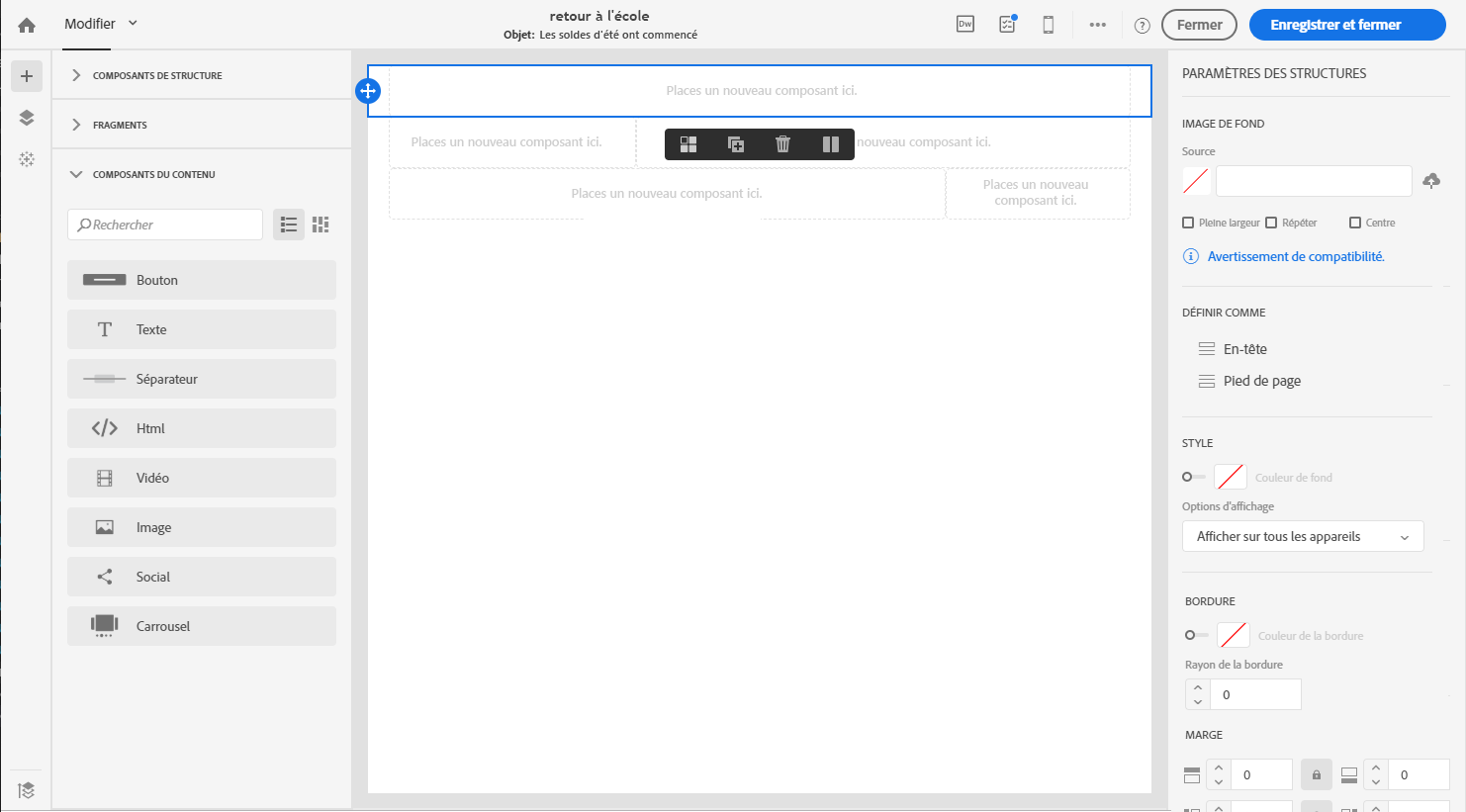 Les composants de structure définiront la disposition de votre email. Pour plus d'informations, voir Définition de la structure d'un email.