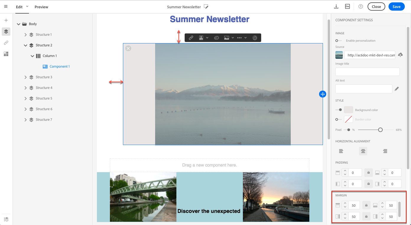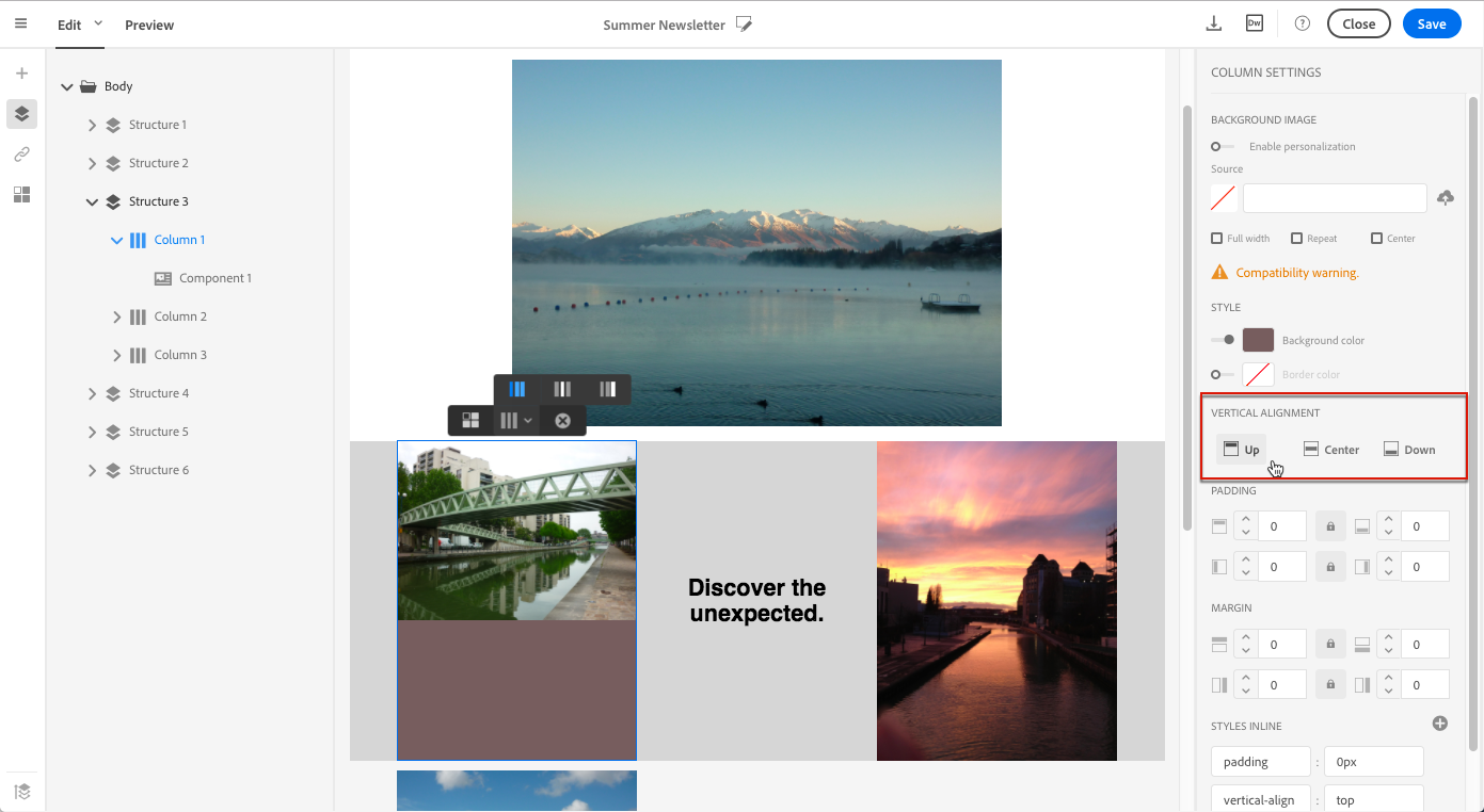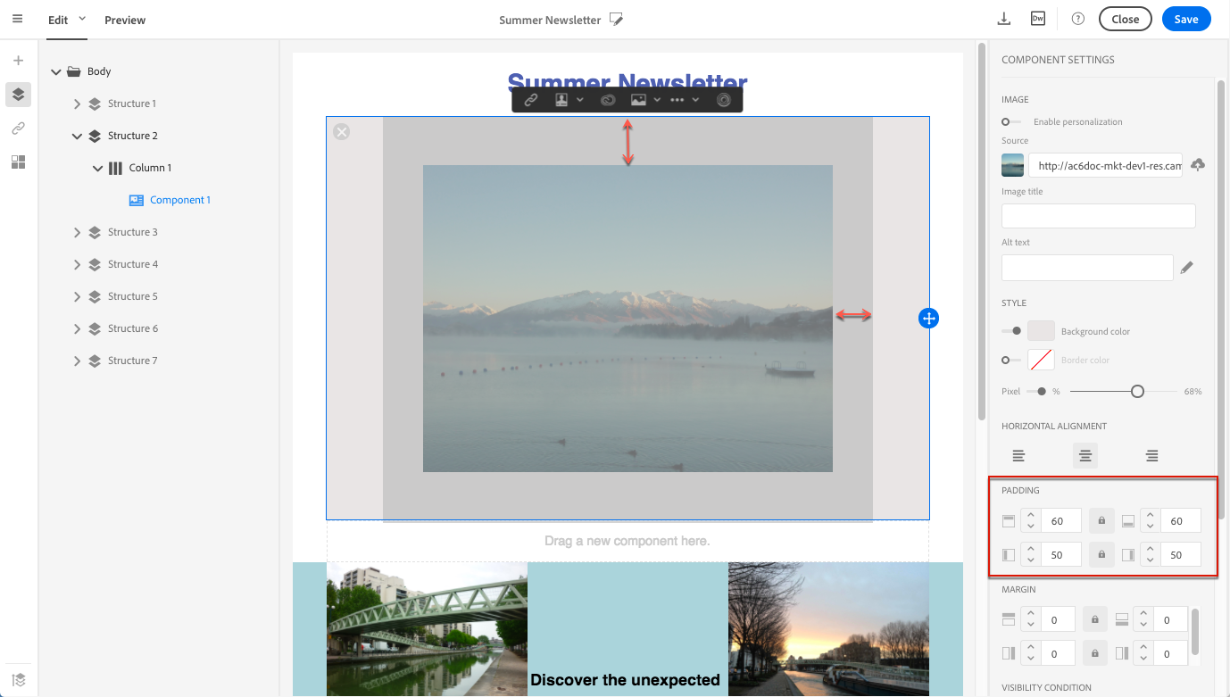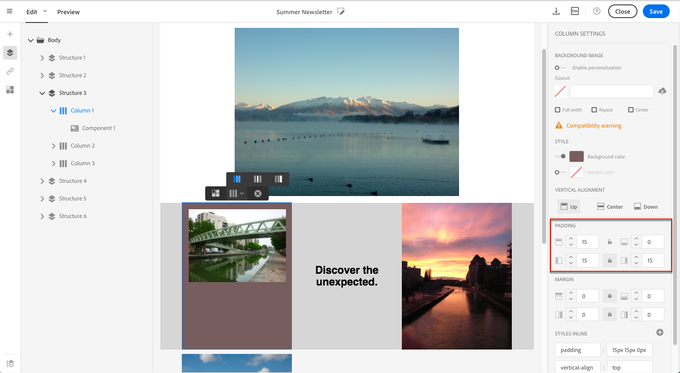 선택 항목(구조 구성 요소, 열 또는 컨텐츠 구성 요소)에 따라 결과는 동일하지 않습니다. Adobe은 Padding 및 Margin 매개 변수를 열 수준에서 지정합니다.