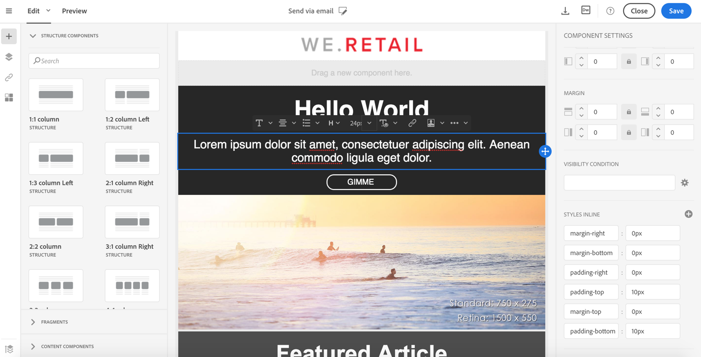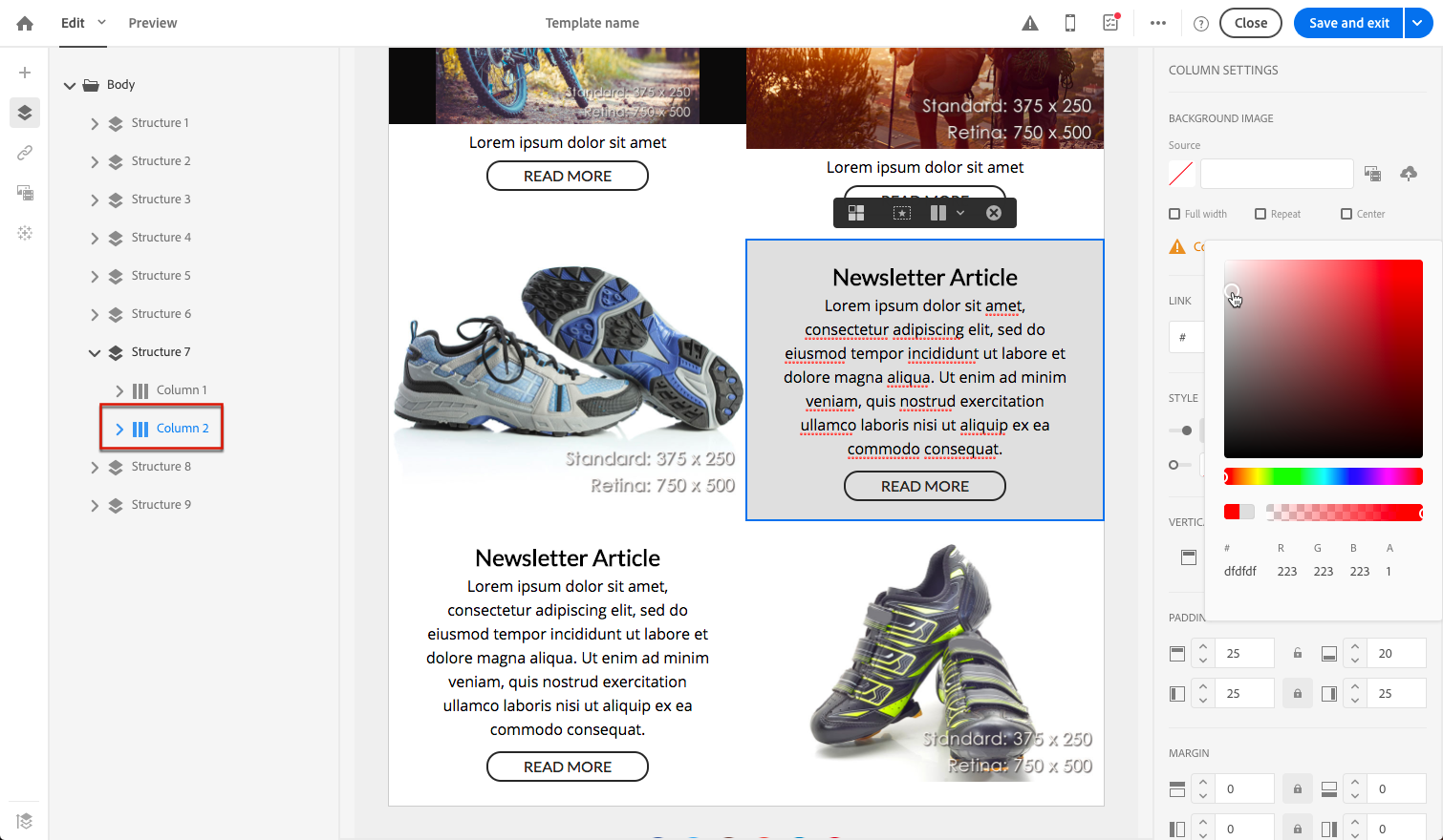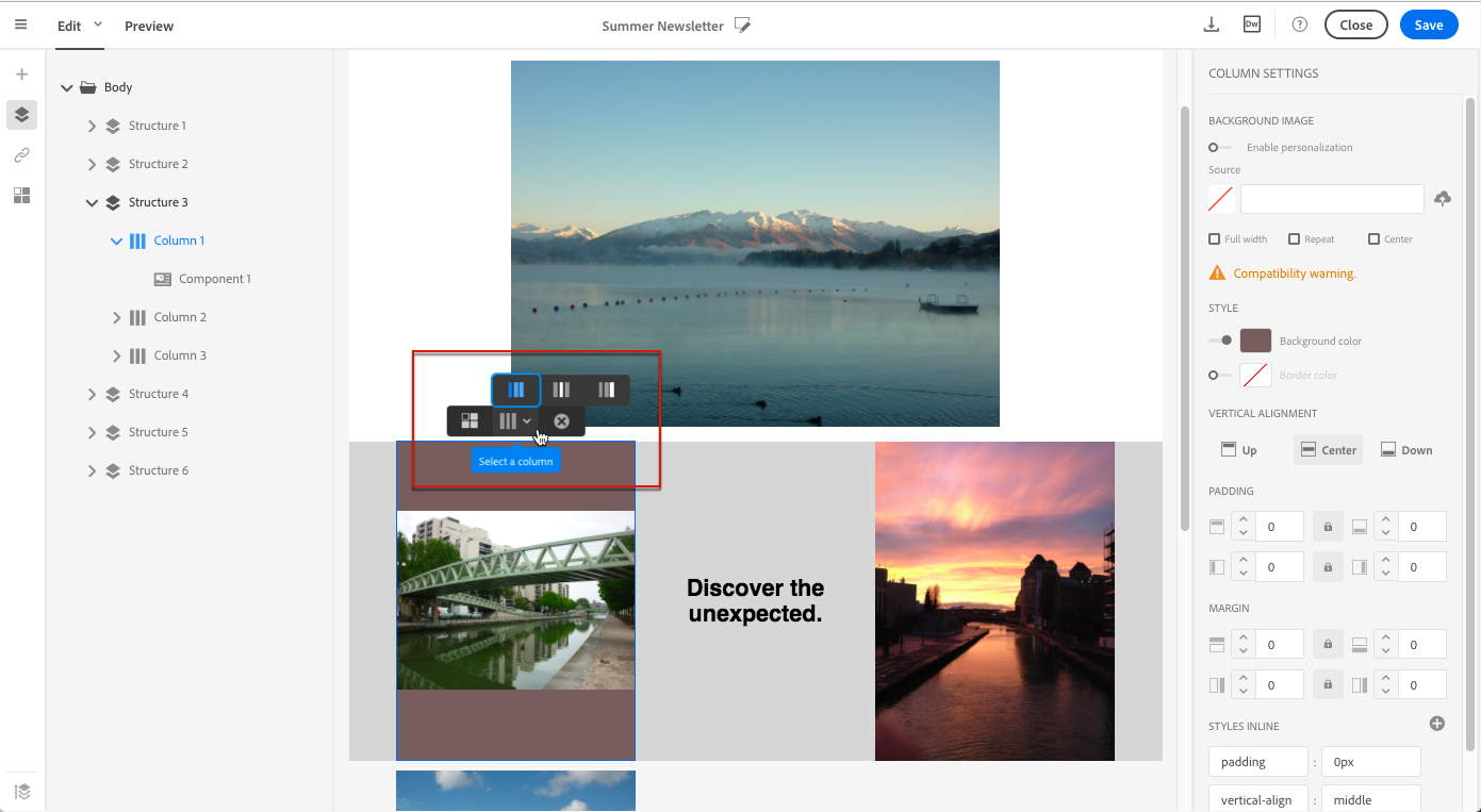 선택 항목(구조 구성 요소, 열 또는 컨텐츠 구성 요소)에 따라 결과는 동일하지 않습니다. Adobe은 Padding 및 Margin 매개 변수를 열 수준에서 지정합니다.