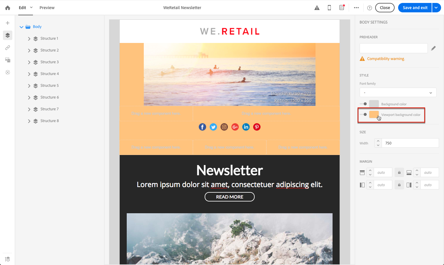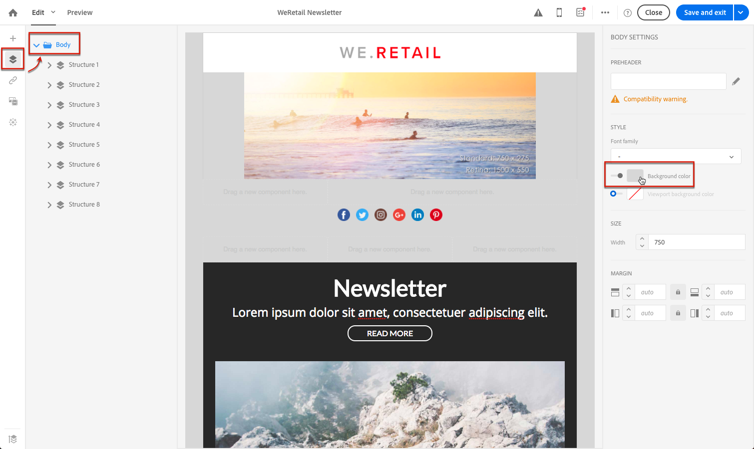 설정 Background color 전체 이메일. 왼쪽 팔레트에서 액세스할 수 있는 탐색 트리에서 본문 설정을 선택해야 합니다.