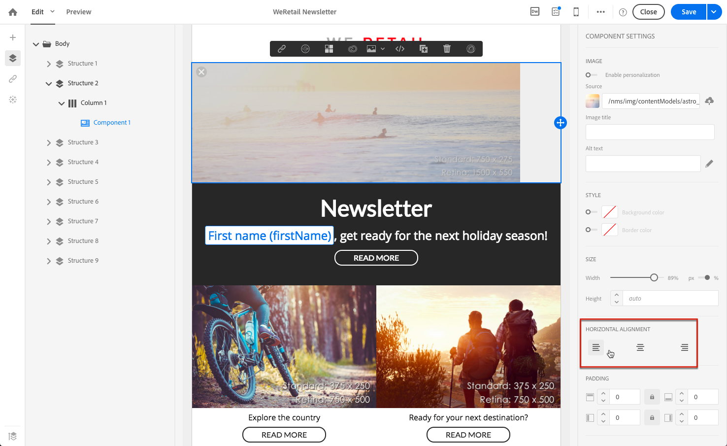 가로 정렬 텍스트, 이미지 및 단추에 적용할 수 있습니다. 현재는 Divider 및 Social 구성 요소.