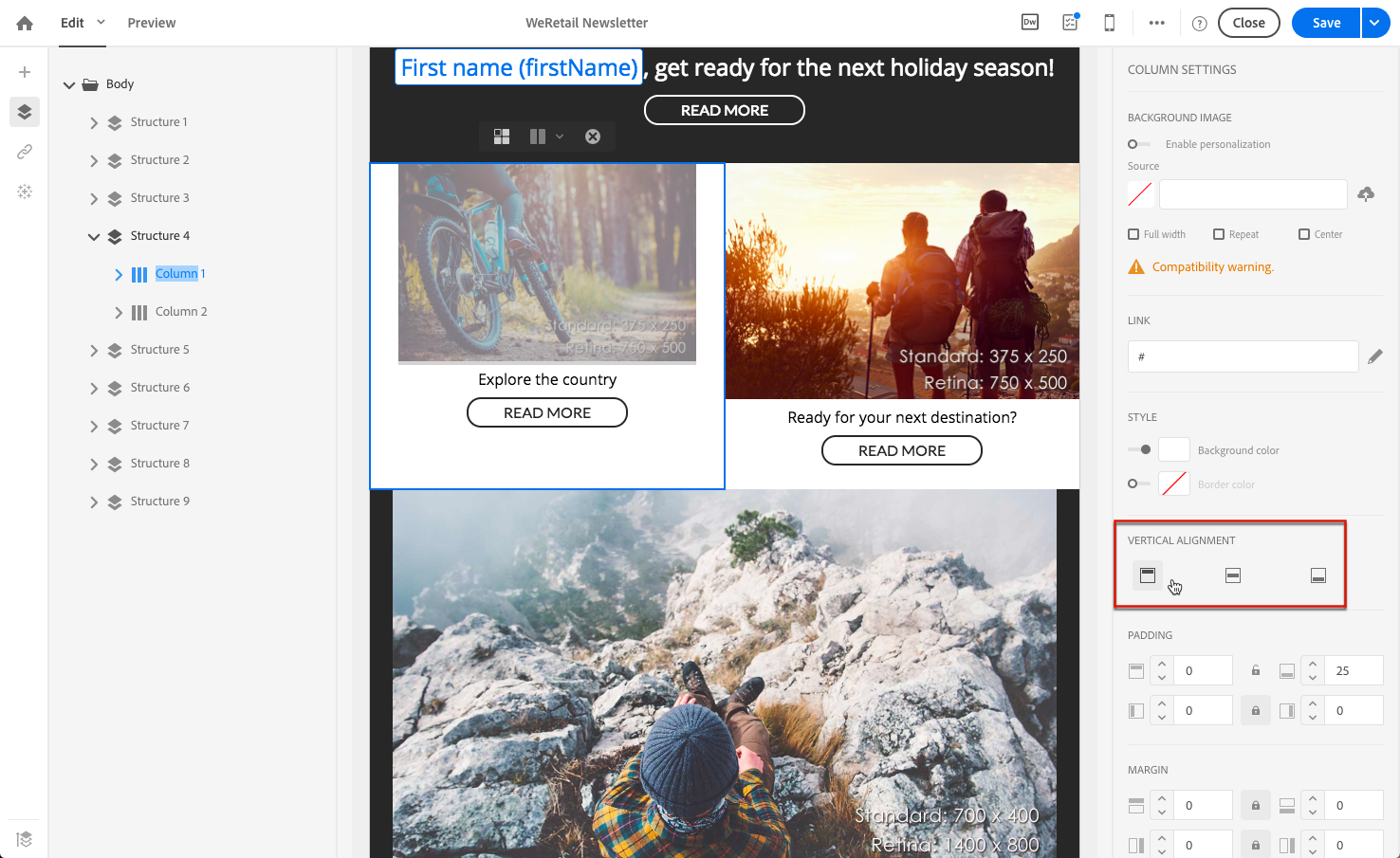 이메일 디자이너 인터페이스를 사용하면 패딩 및 여백 설정을 빠르게 조정할 수 있습니다.