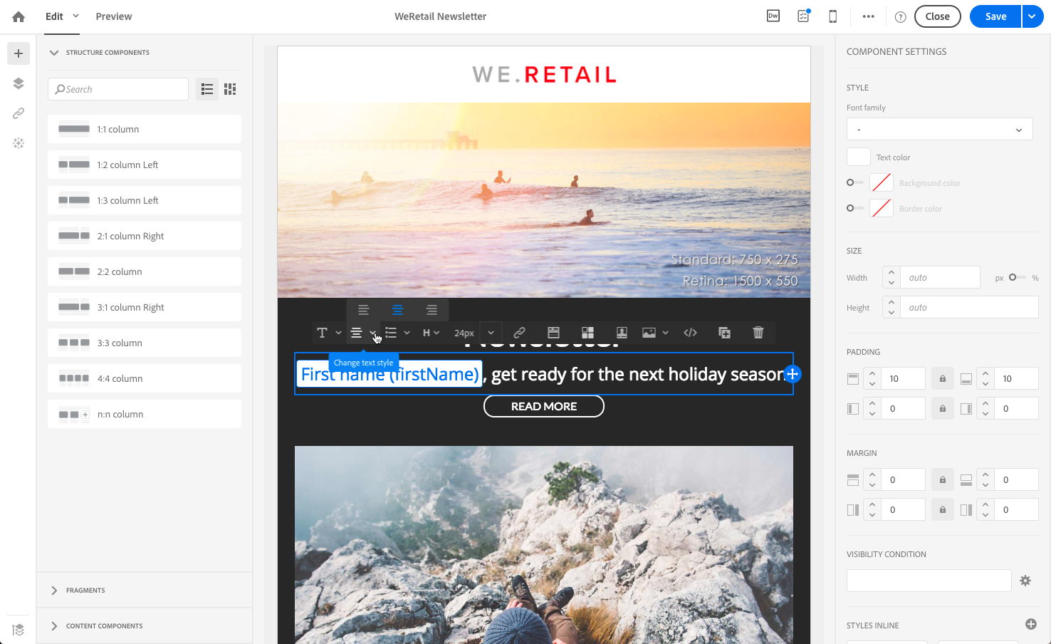 이메일 디자이너에서 요소를 선택할 때 선택한 컨텐츠 유형에 대한 몇 가지 옵션이 Settings 창 이러한 옵션을 사용하여 전자 메일 스타일을 쉽게 변경할 수 있습니다.