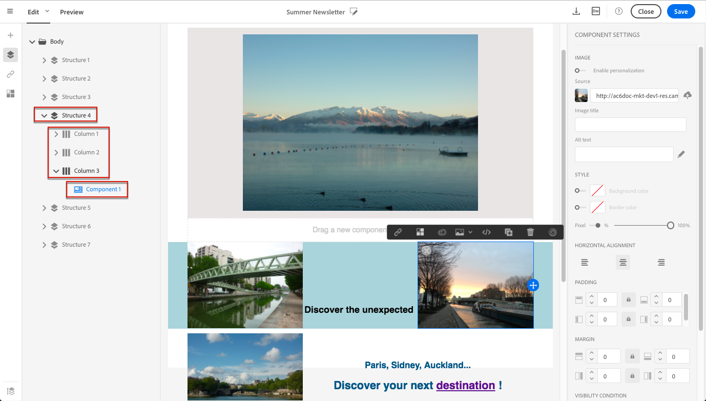 이메일에서 직접 또는 왼쪽에서 사용할 수 있는 구조 트리를 사용하여 구조 구성 요소를 선택합니다 팔레트.